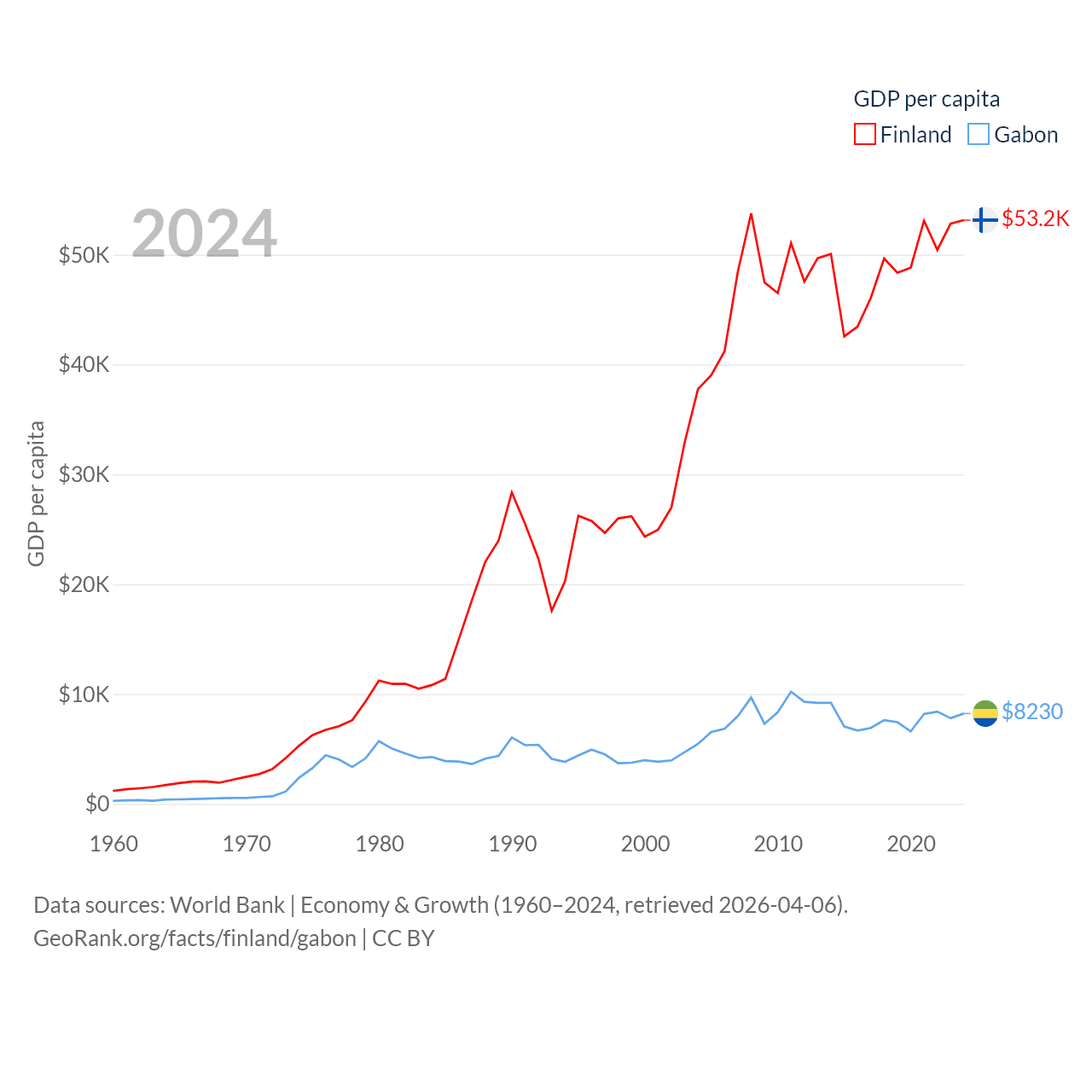 By GDP, Finland ranks 47/197 ($299B) and Gabon ranks 127/197 ($20.9B). By GDP per capita, Finland ranks 23/197 ($53,150), while Gabon ranks 93/197 ($8,230).