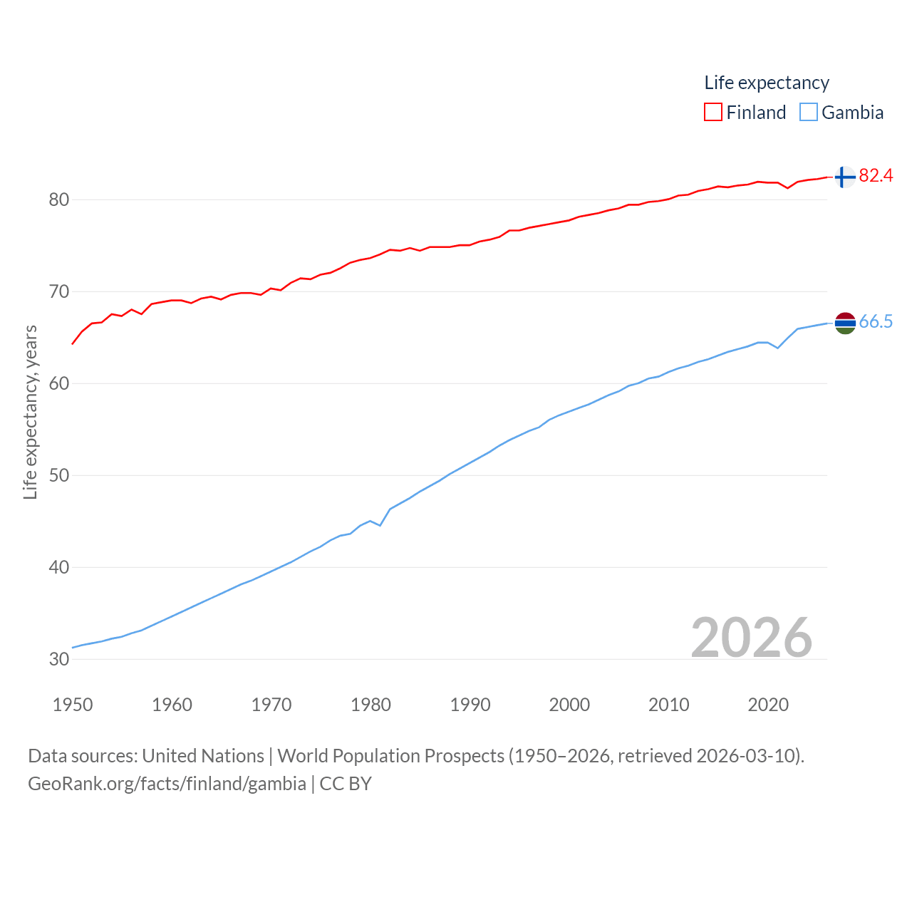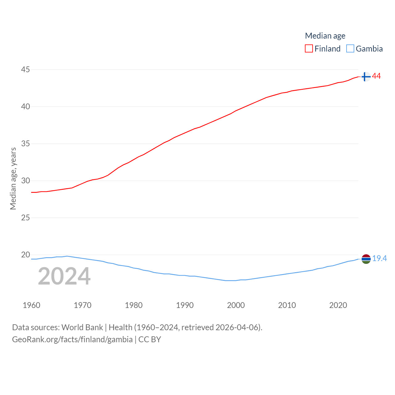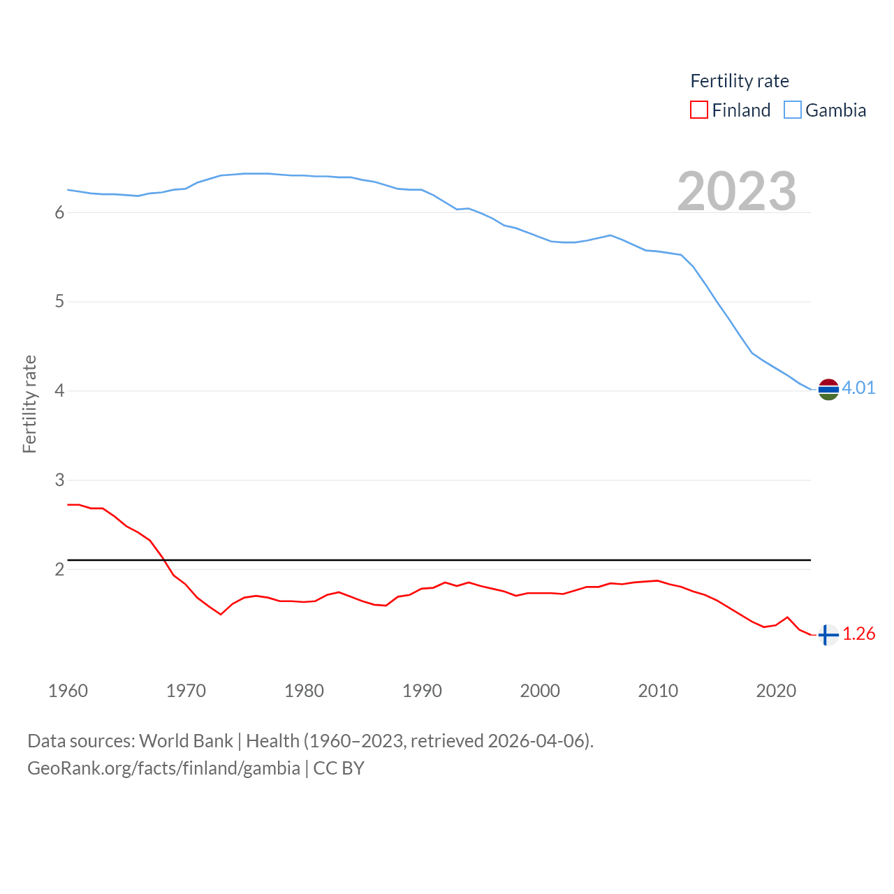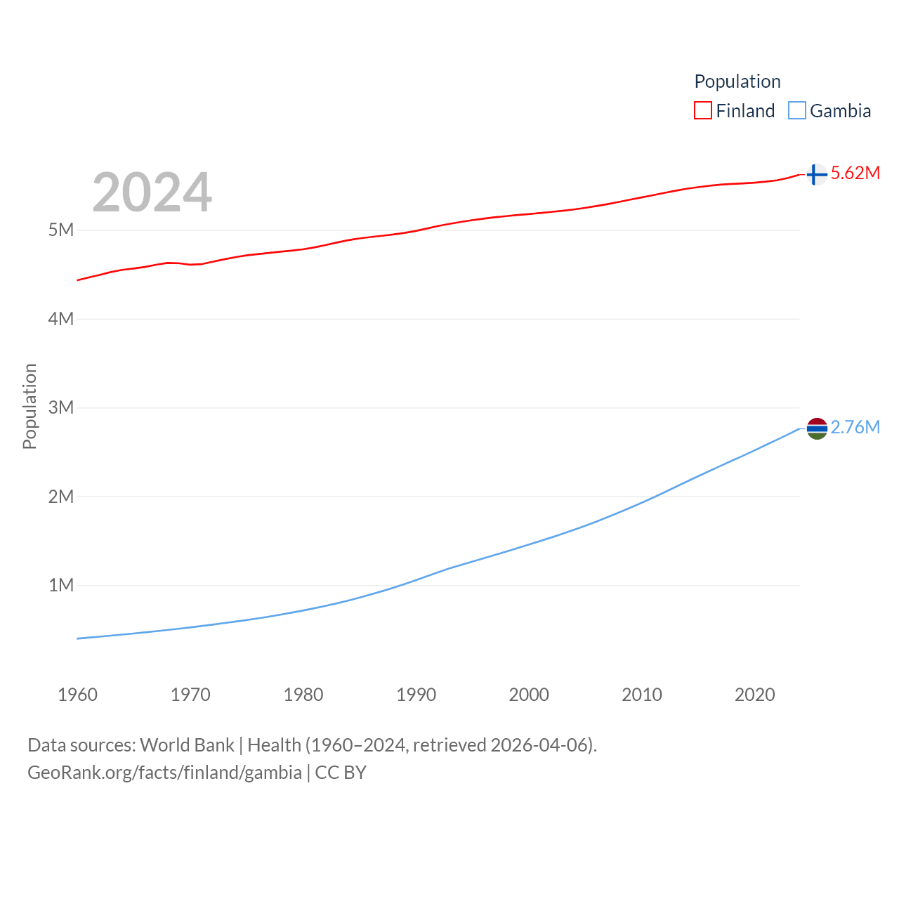 Finland has a population of 5.62M (ranked 116/197), compared with 2.76M in The Gambia (ranked 140/197). Finland's land area is 117,360 sq mi versus 3,907 sq mi for The Gambia (ranked 70th vs. 161st).
