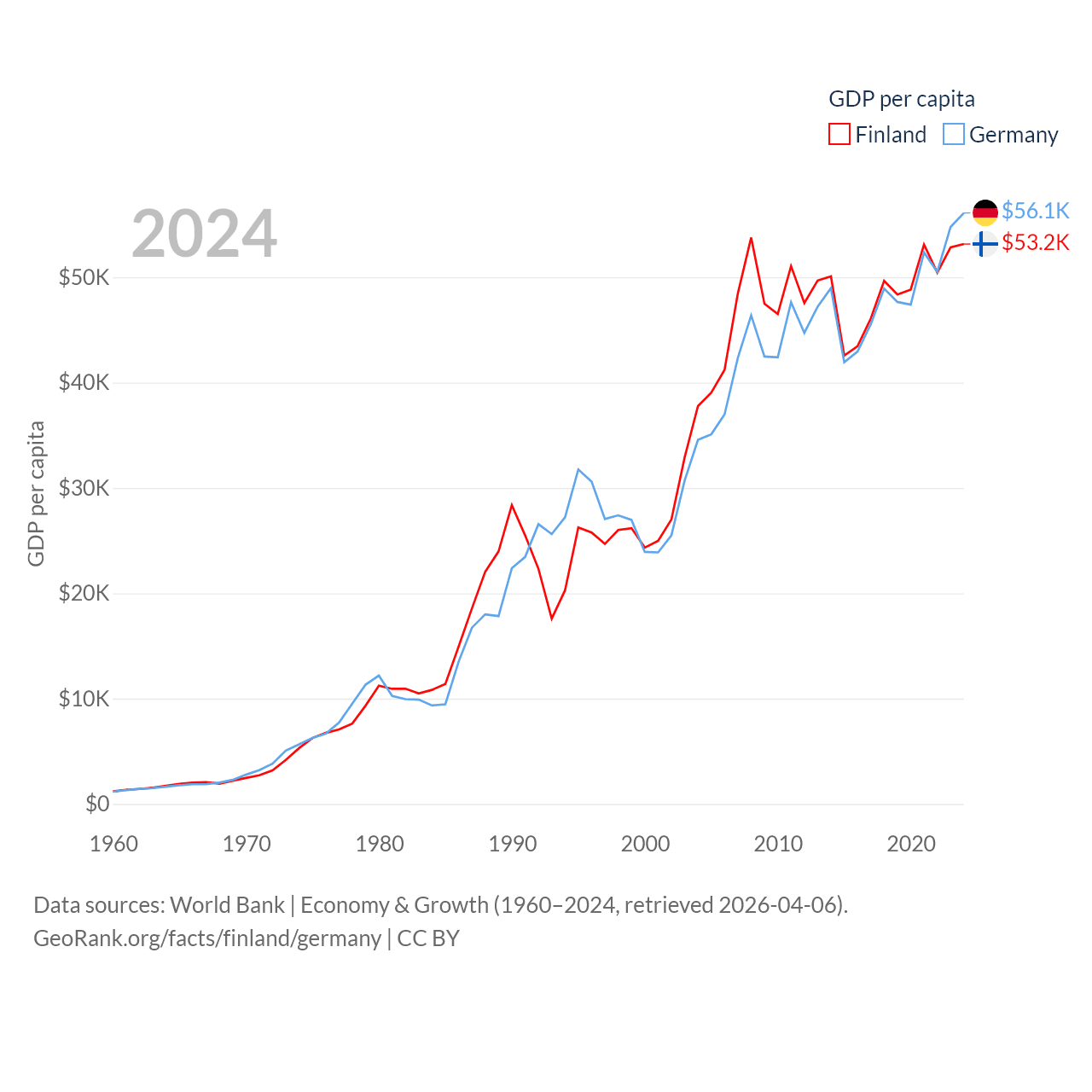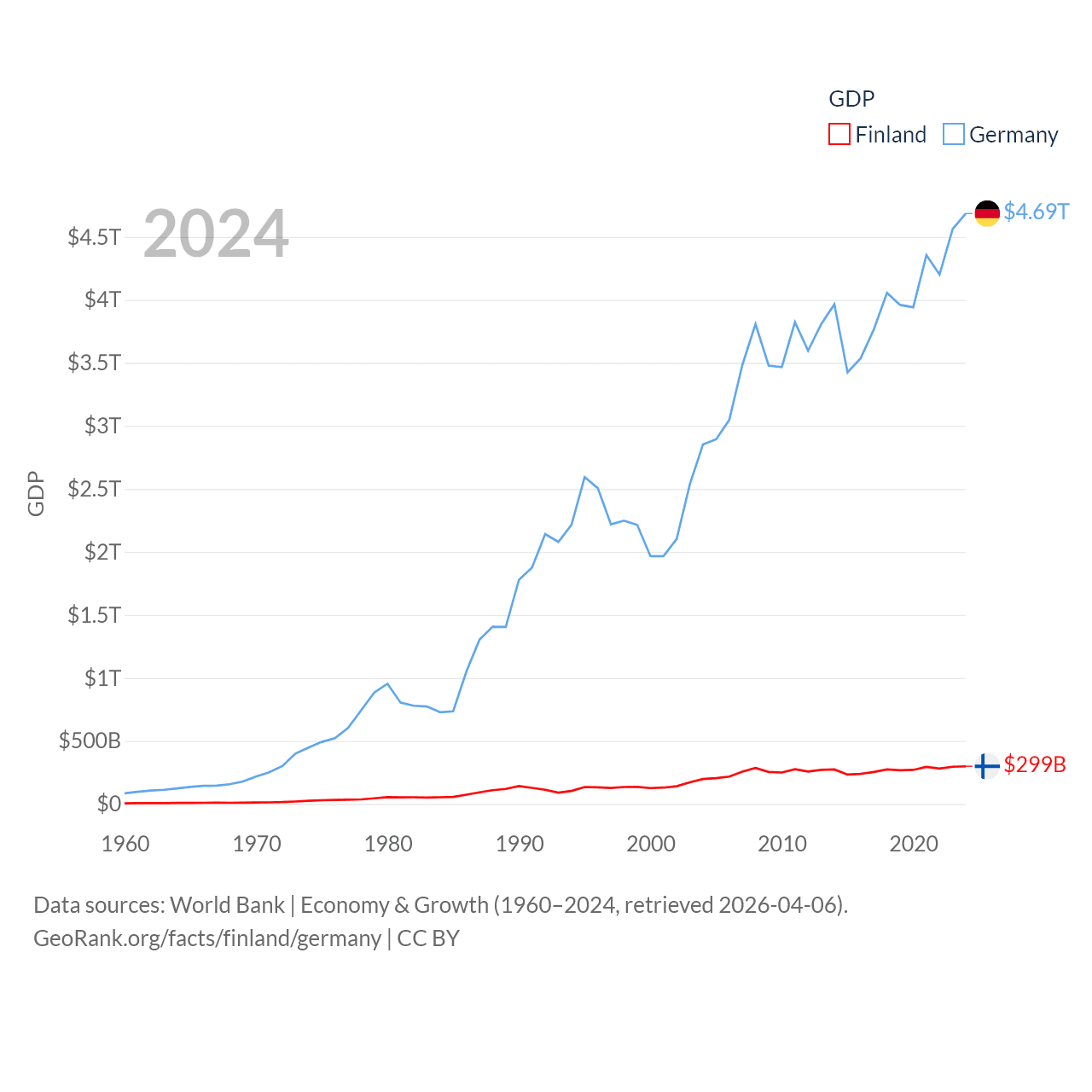 By GDP, Finland ranks 47/197 ($299B) and Germany ranks 3/197 ($4.69T). By GDP per capita, Finland ranks 23/197 ($53,150), while Germany ranks 19/197 ($56,104).