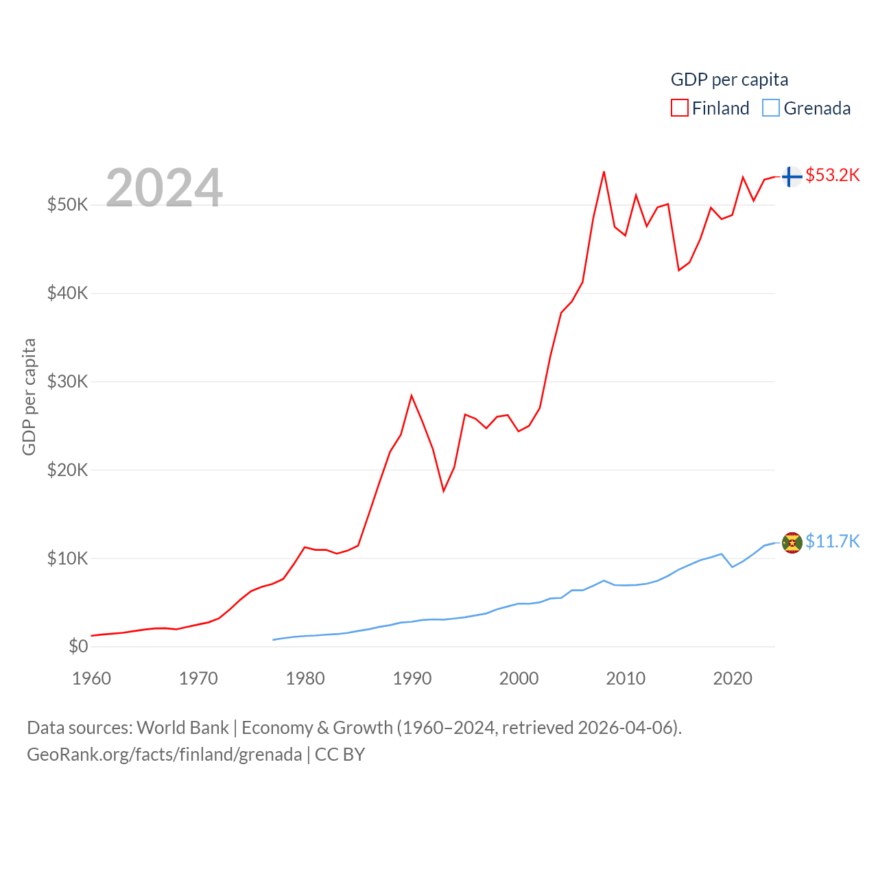 By GDP, Finland ranks 47/197 ($299B) and Grenada ranks 184/197 ($1.37B). By GDP per capita, Finland ranks 23/197 ($53,150), while Grenada ranks 80/197 ($11,705).
