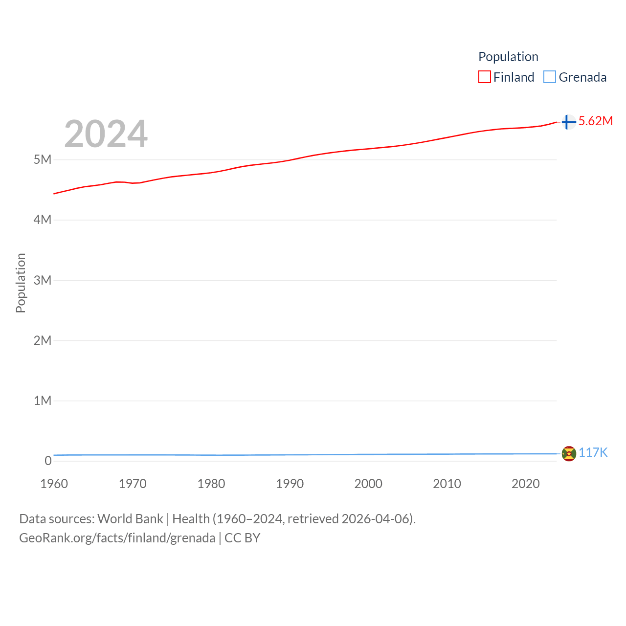 Finland has a population of 5.62M (ranked 116/197), compared with 117K in Grenada (ranked 182/197). Finland's land area is 117,360 sq mi versus 131.3 sq mi for Grenada (ranked 70th vs. 186th).