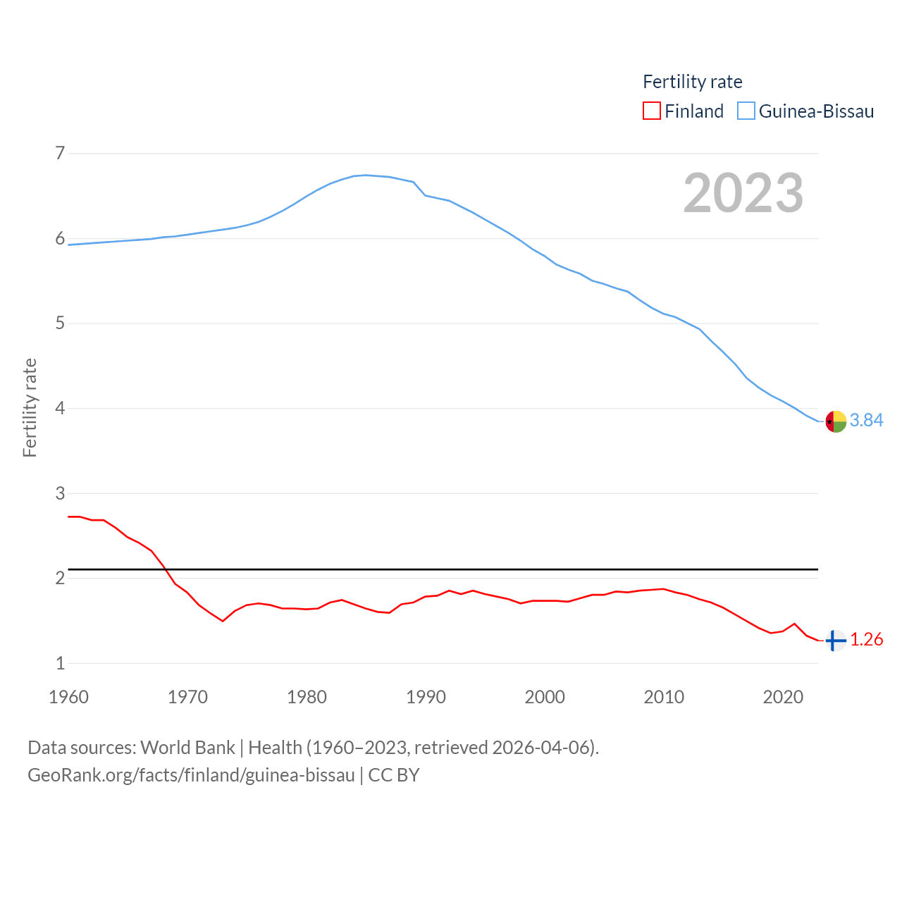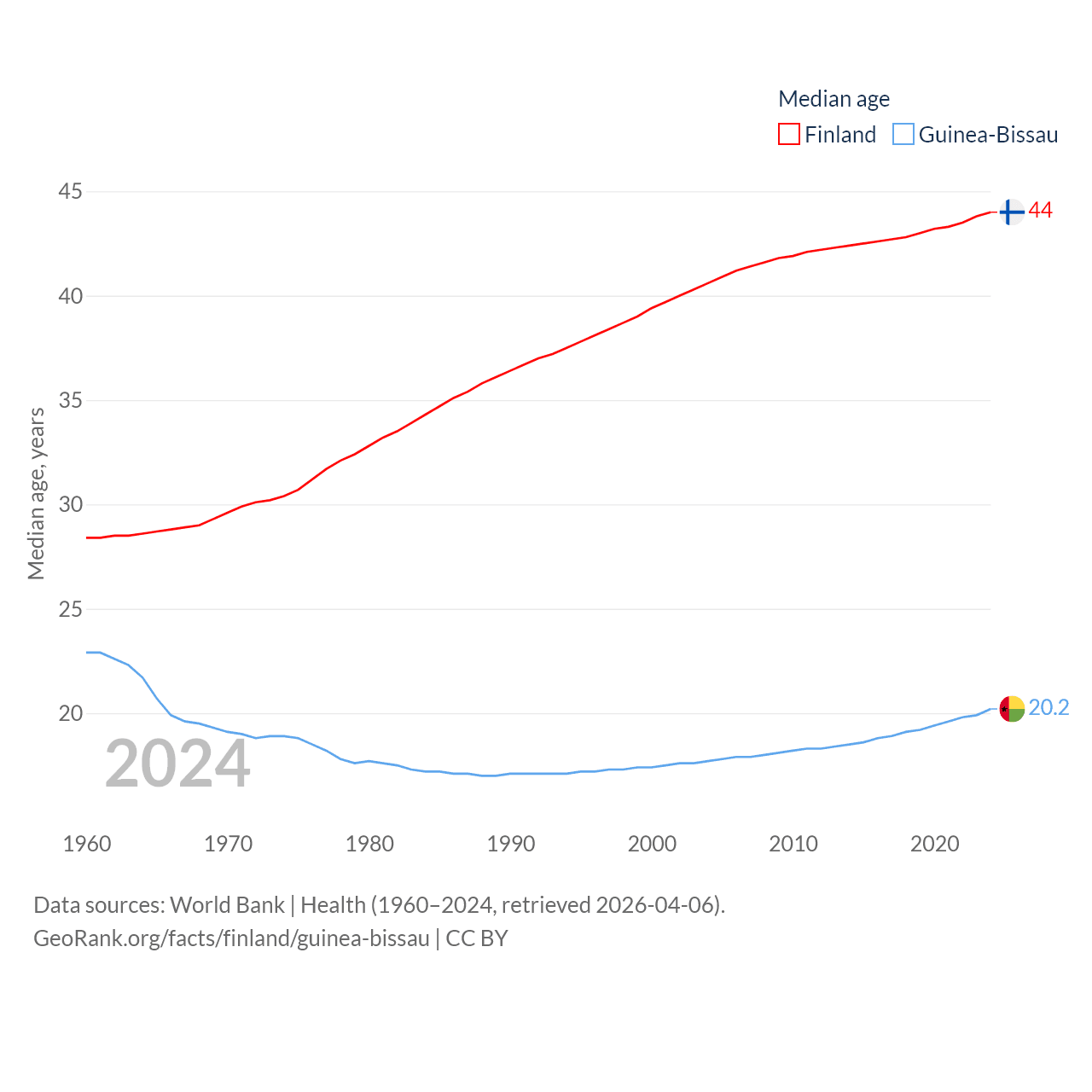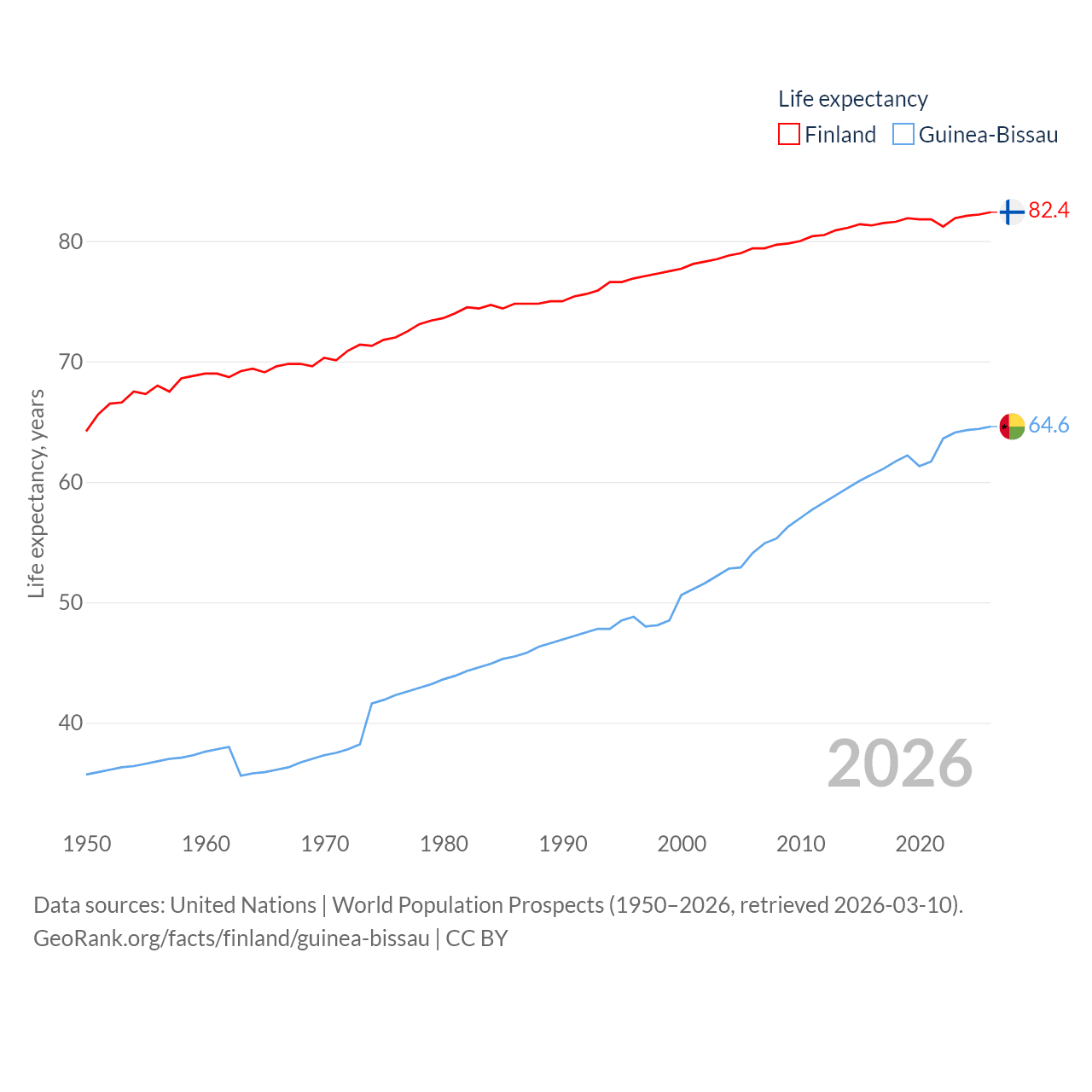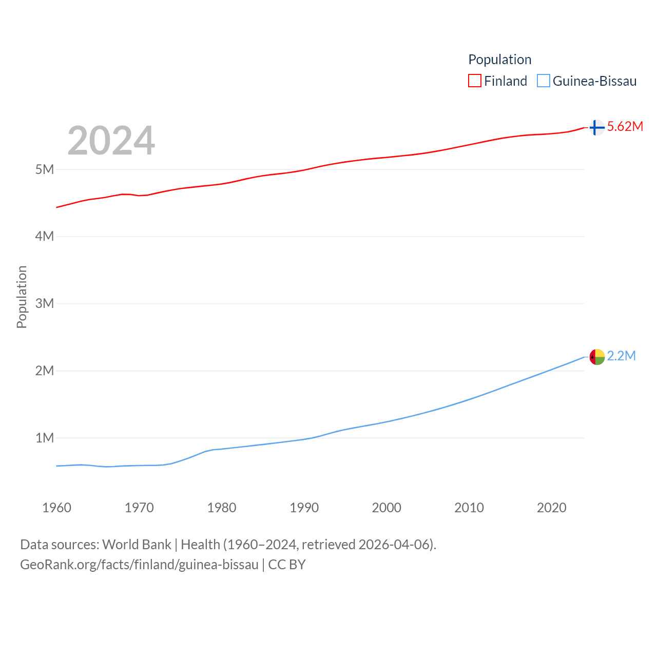 Finland has a population of 5.62M (ranked 116/197), compared with 2.2M in Guinea-Bissau (ranked 146/197). Finland's land area is 117,360 sq mi versus 10,857 sq mi for Guinea-Bissau (ranked 70th vs. 139th).