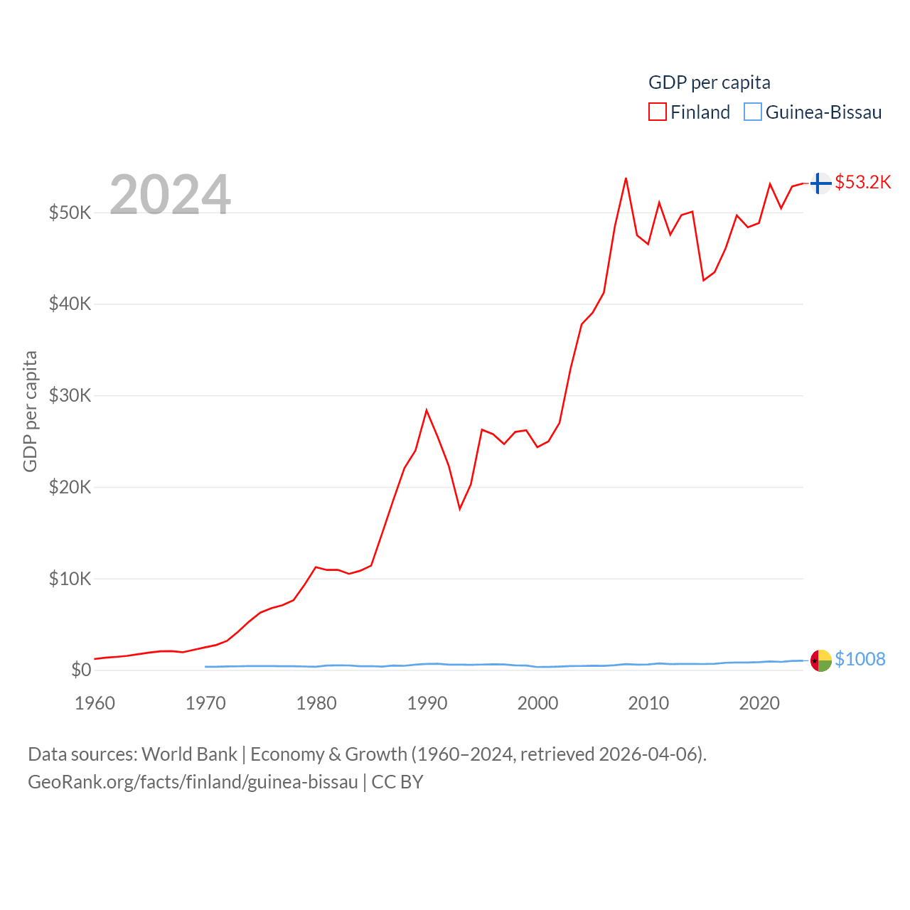 By GDP, Finland ranks 47/197 ($299B) and Guinea-Bissau ranks 176/197 ($2.22B). By GDP per capita, Finland ranks 23/197 ($53,150), while Guinea-Bissau ranks 177/197 ($1,008).