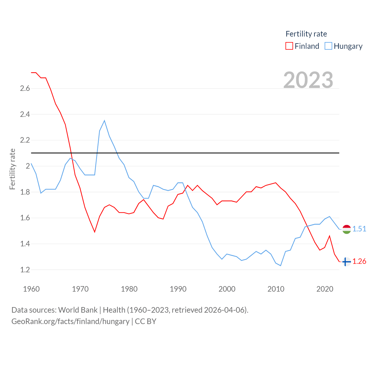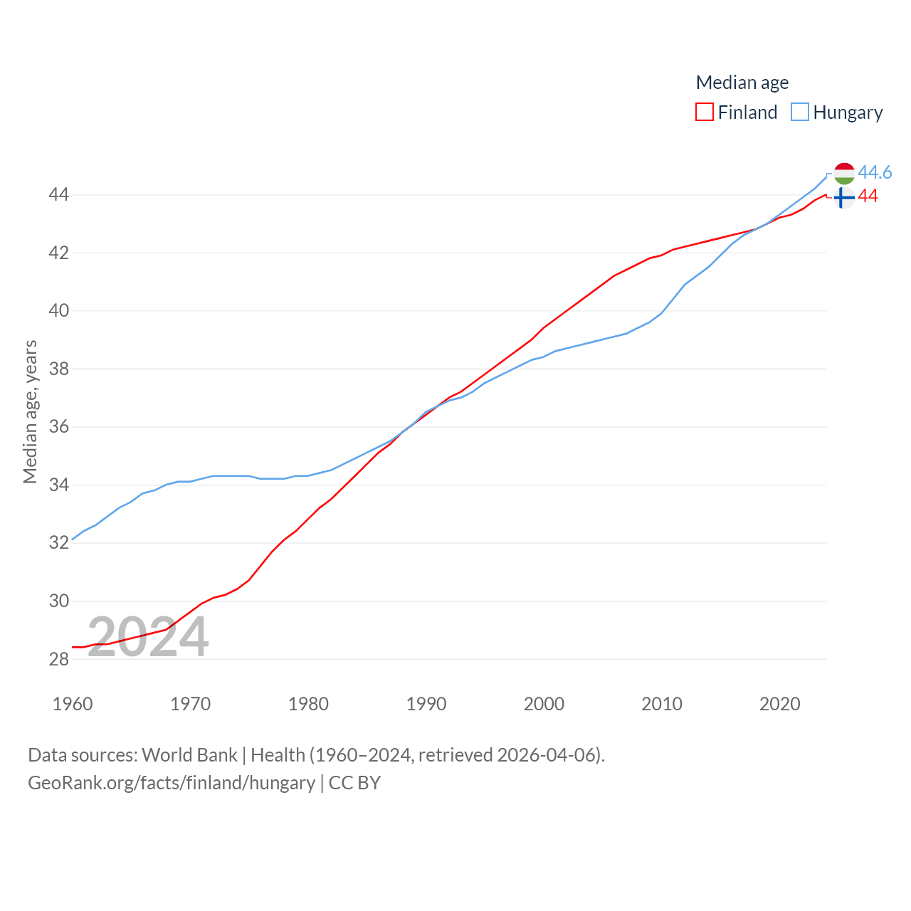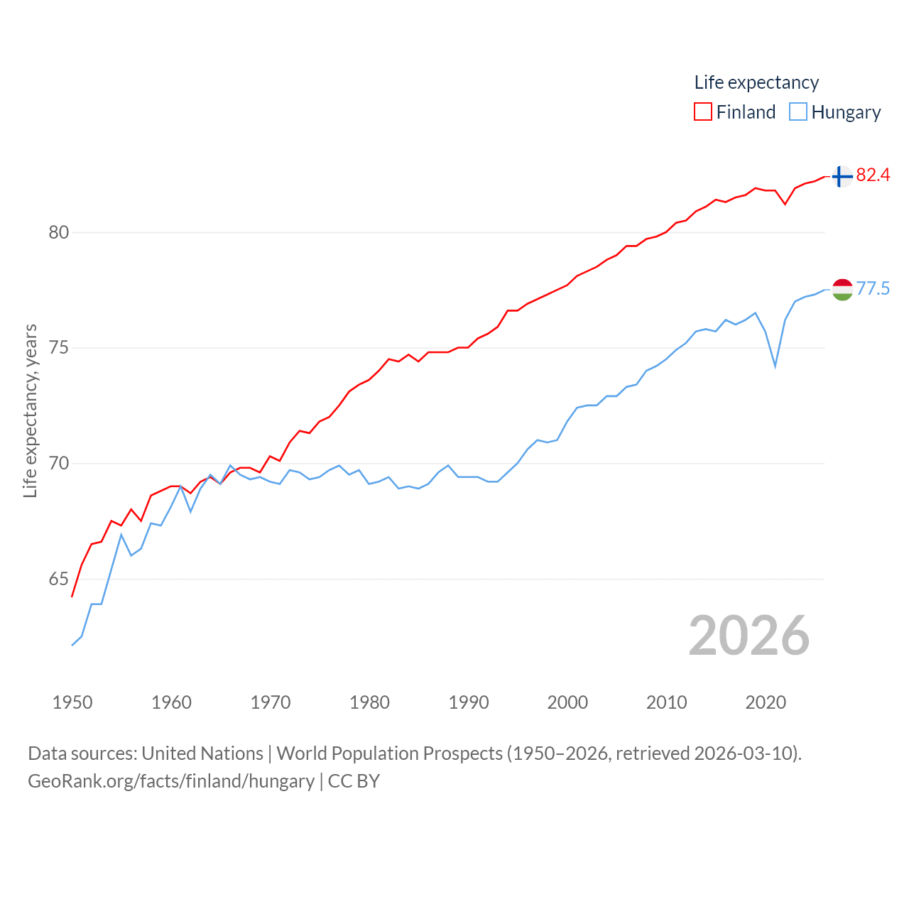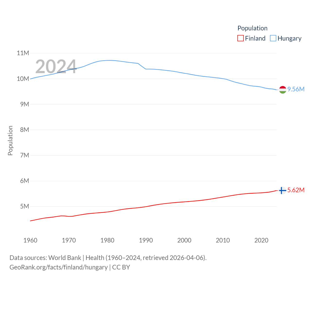 Finland has a population of 5.62M (ranked 116/197), compared with 9.56M in Hungary (ranked 97/197). Finland's land area is 117,360 sq mi versus 35,236 sq mi for Hungary (ranked 70th vs. 109th).