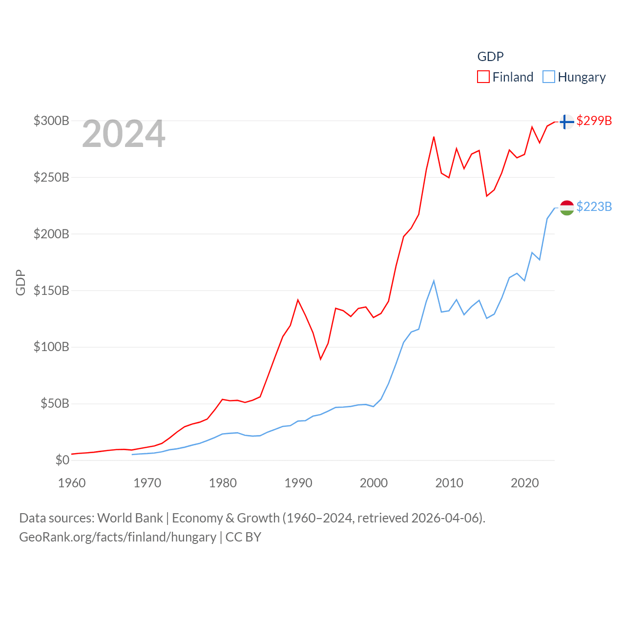 By GDP, Finland ranks 47/197 ($299B) and Hungary ranks 55/197 ($223B). By GDP per capita, Finland ranks 23/197 ($53,150), while Hungary ranks 55/197 ($23,292).