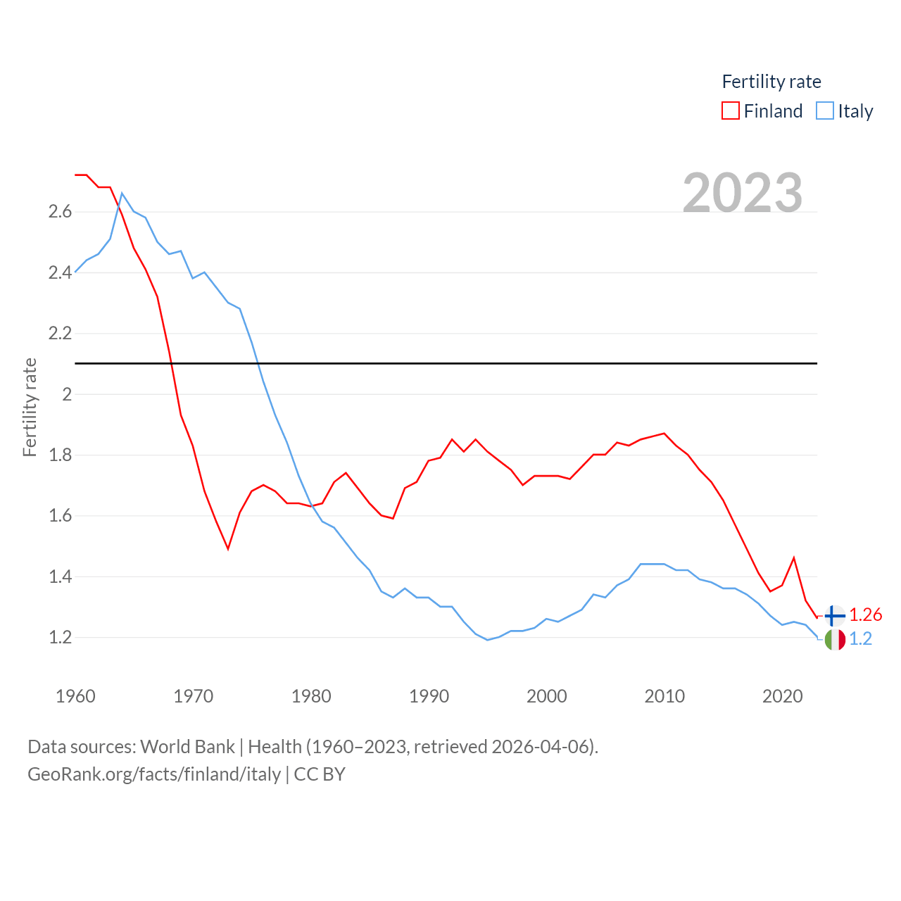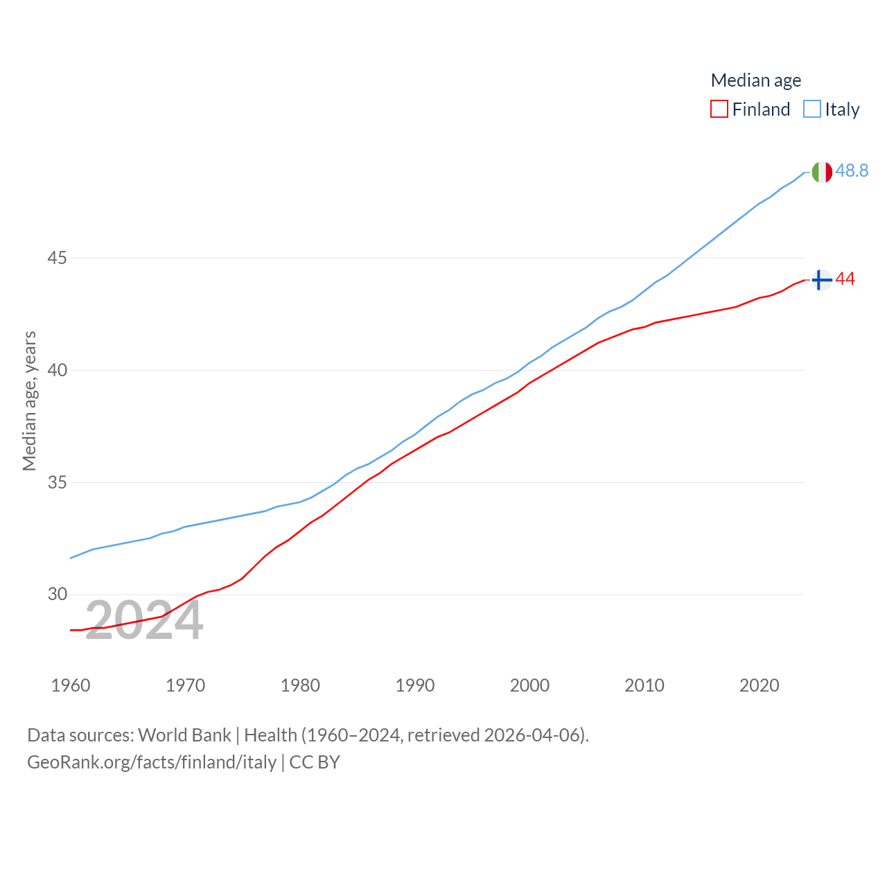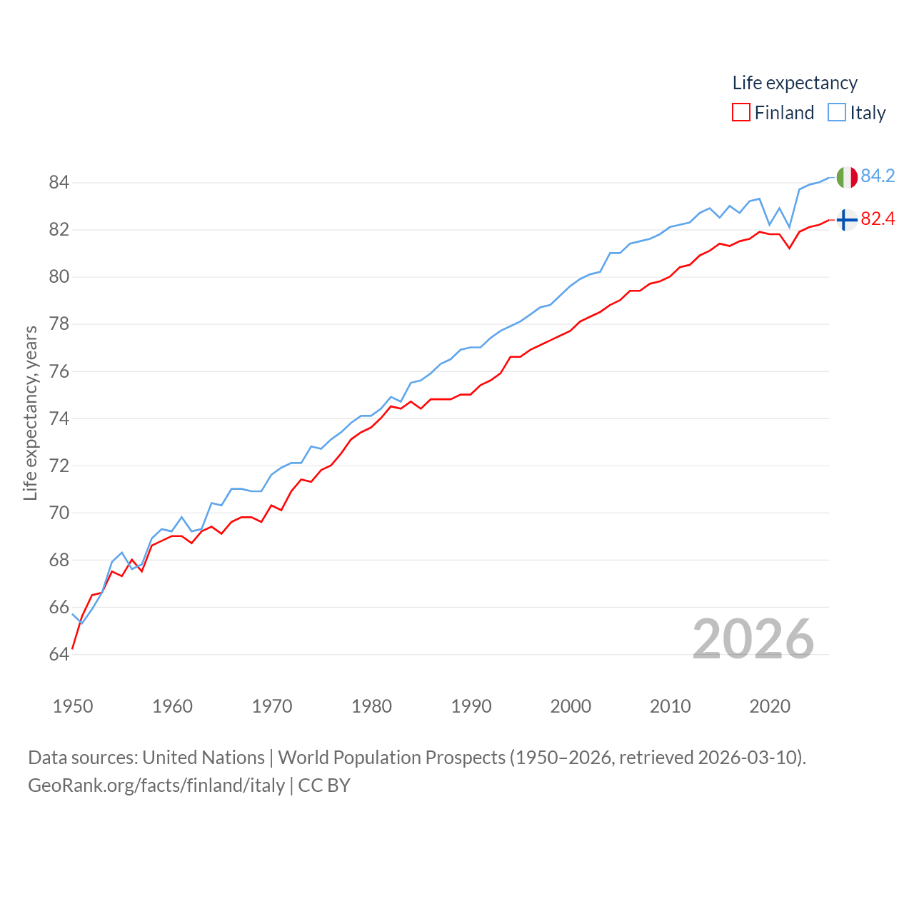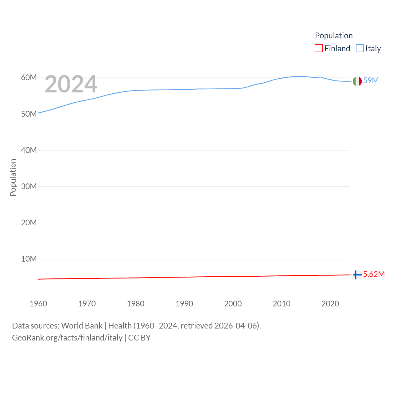 Finland has a population of 5.62M (ranked 116/197), compared with 59M in Italy (ranked 25/197). Finland's land area is 117,360 sq mi versus 114,178 sq mi for Italy (ranked 70th vs. 72nd).