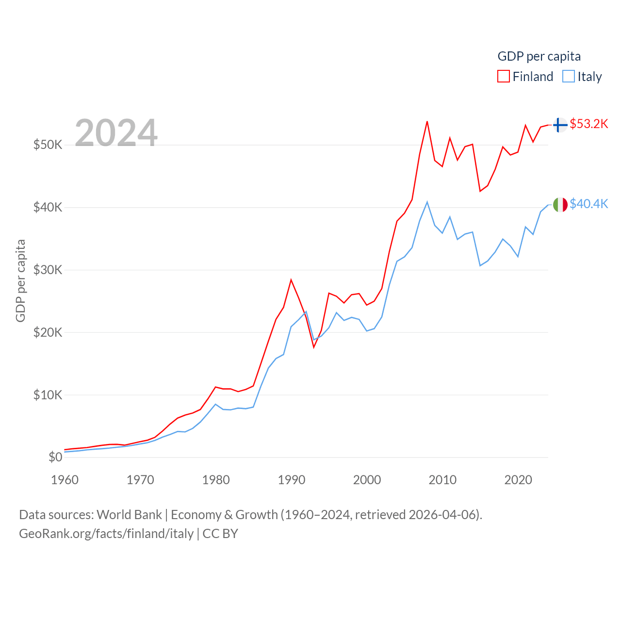 By GDP, Finland ranks 47/197 ($299B) and Italy ranks 8/197 ($2.38T). By GDP per capita, Finland ranks 23/197 ($53,150), while Italy ranks 29/197 ($40,385).