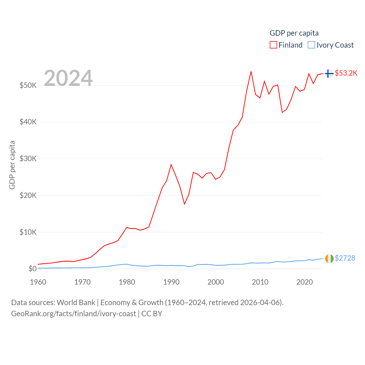 By GDP, Finland ranks 47/197 ($299B) and Ivory Coast ranks 77/197 ($87.1B). By GDP per capita, Finland ranks 23/197 ($53,150), while Ivory Coast ranks 142/197 ($2,728).