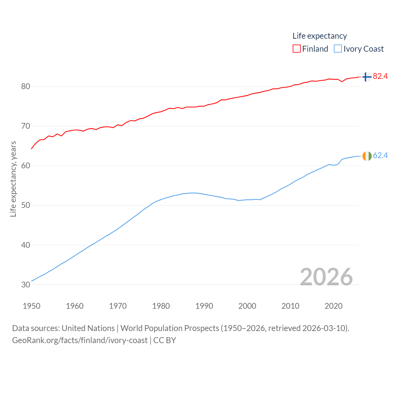 Finland has a population of 5.62M (ranked 116/197), compared with 31.9M in Ivory Coast (ranked 50/197). Finland's land area is 117,360 sq mi versus 122,780 sq mi for Ivory Coast (ranked 70th vs. 66th).