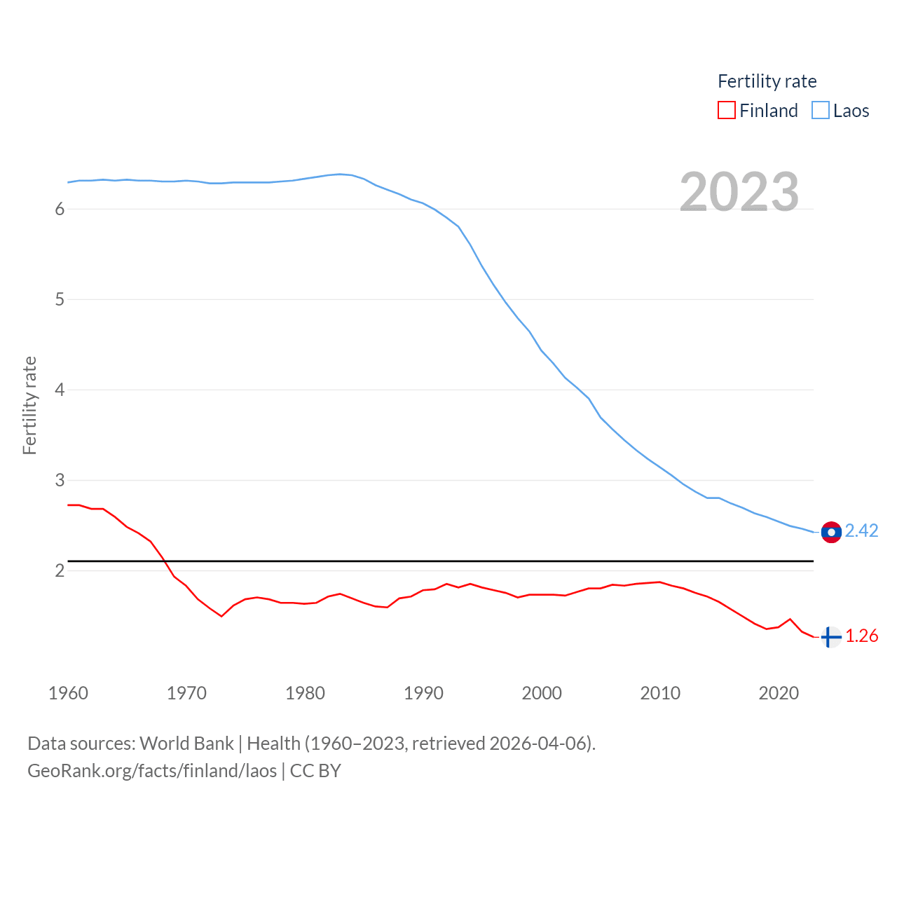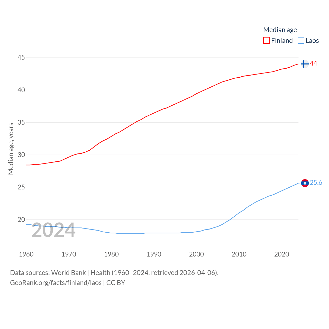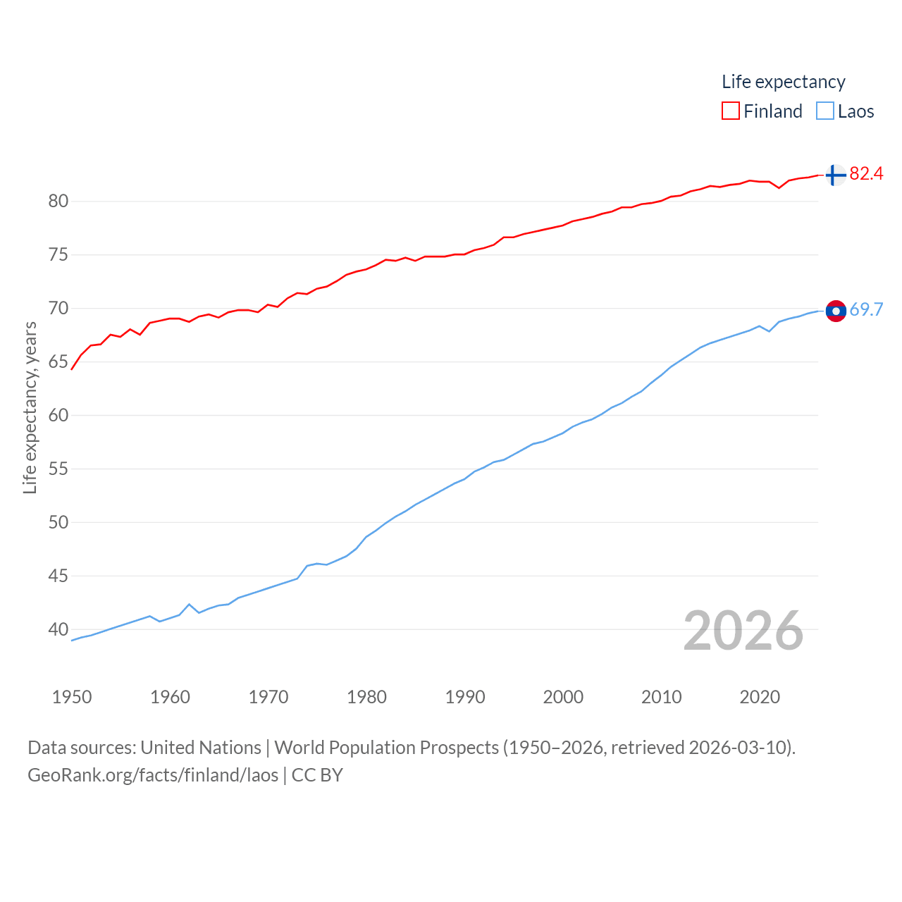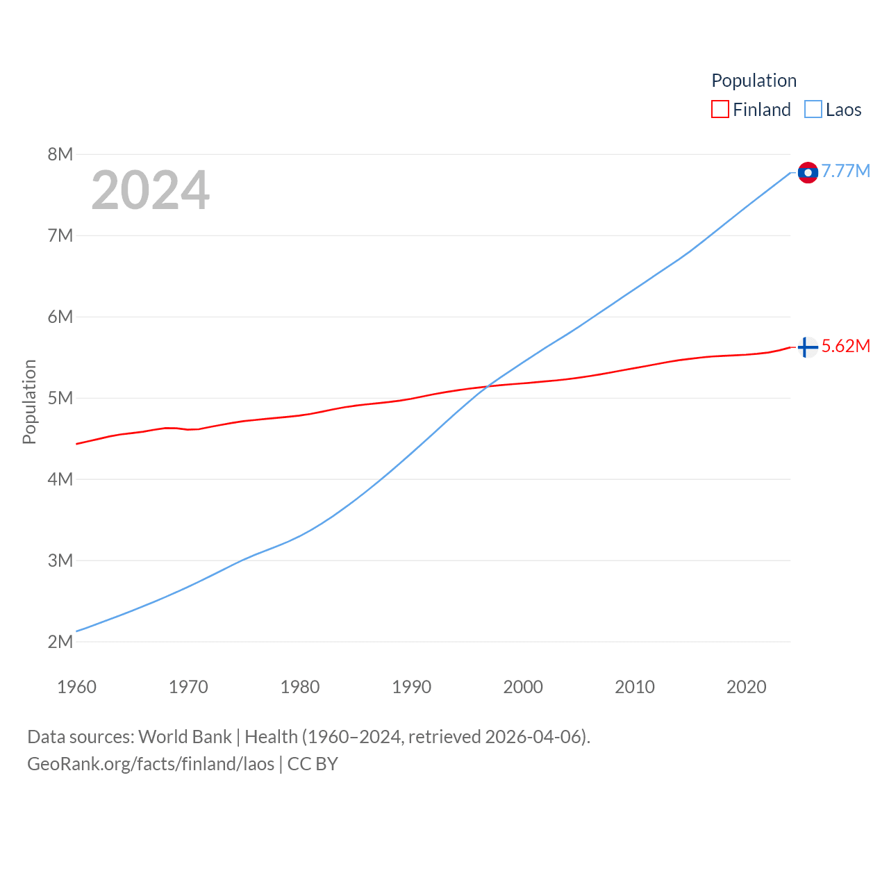 Finland has a population of 5.62M (ranked 116/197), compared with 7.77M in Laos (ranked 103/197). Finland's land area is 117,360 sq mi versus 89,112 sq mi for Laos (ranked 70th vs. 79th).