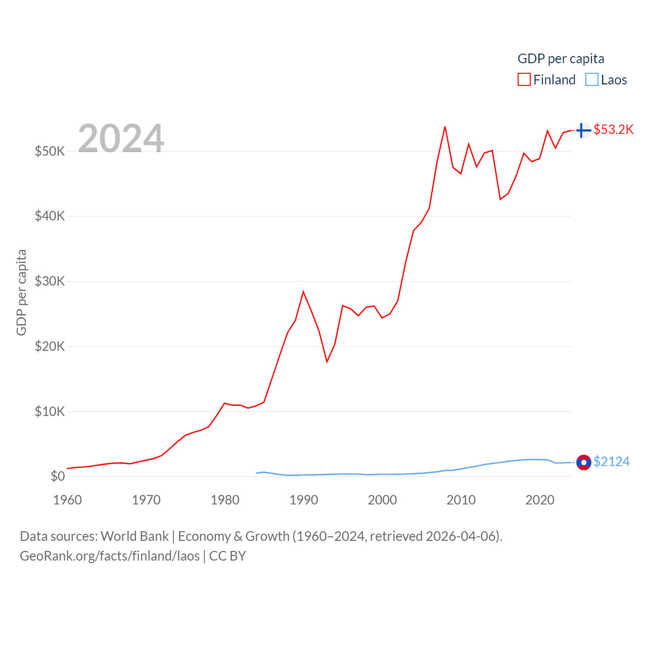 By GDP, Finland ranks 47/197 ($299B) and Laos ranks 139/197 ($16.5B). By GDP per capita, Finland ranks 23/197 ($53,150), while Laos ranks 155/197 ($2,124).