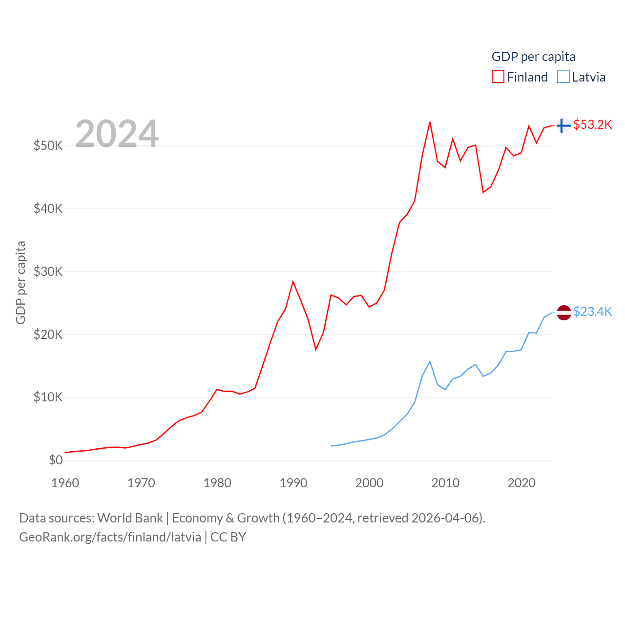 By GDP, Finland ranks 47/197 ($299B) and Latvia ranks 99/197 ($43.7B). By GDP per capita, Finland ranks 23/197 ($53,150), while Latvia ranks 54/197 ($23,409).