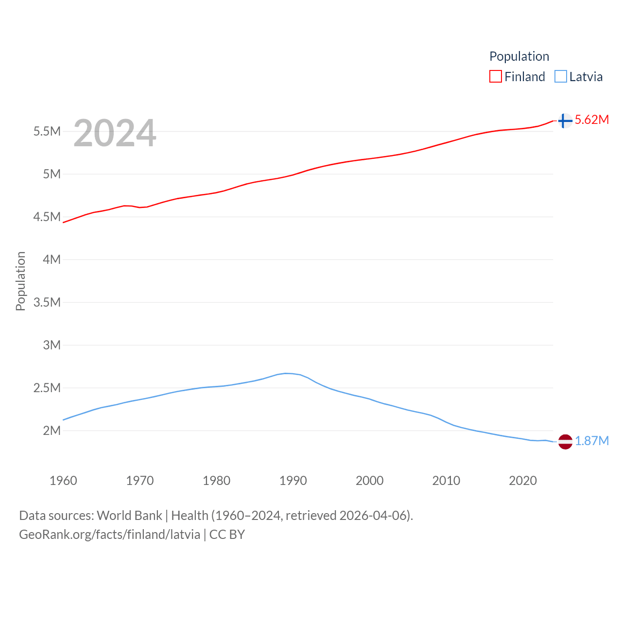 Finland has a population of 5.62M (ranked 116/197), compared with 1.87M in Latvia (ranked 149/197). Finland's land area is 117,360 sq mi versus 24,027 sq mi for Latvia (ranked 70th vs. 121st).