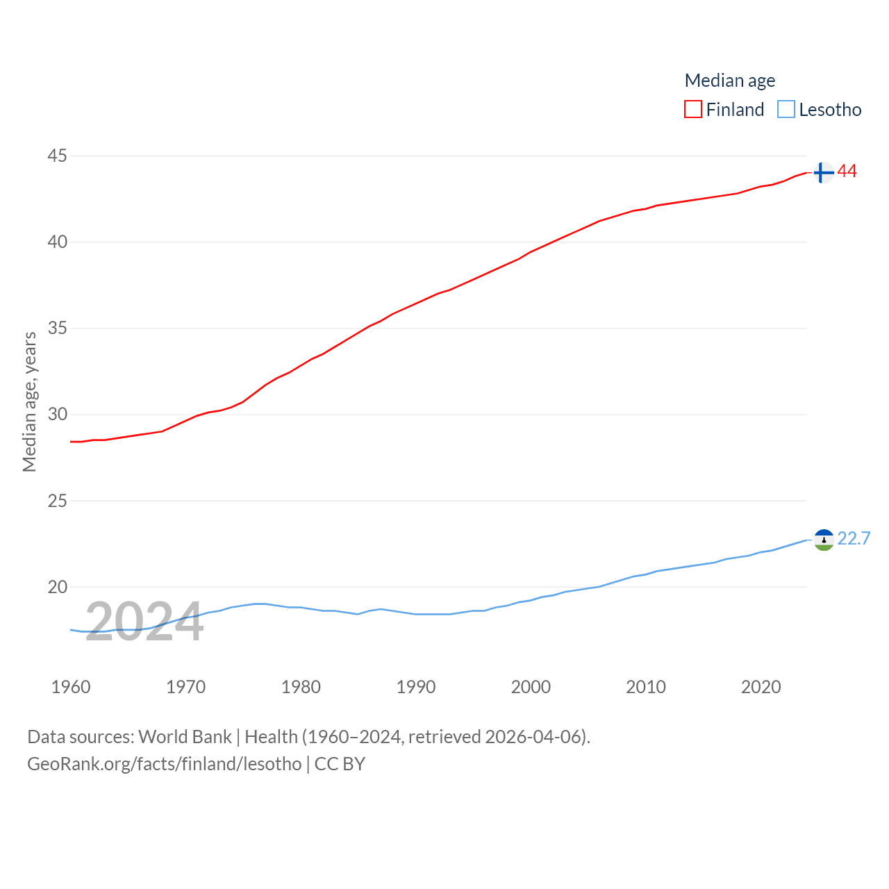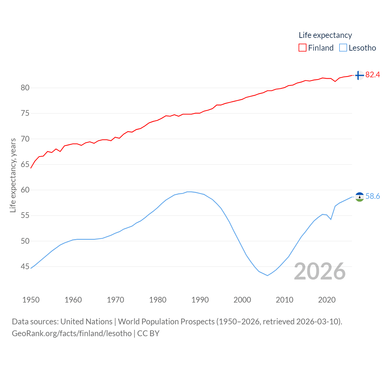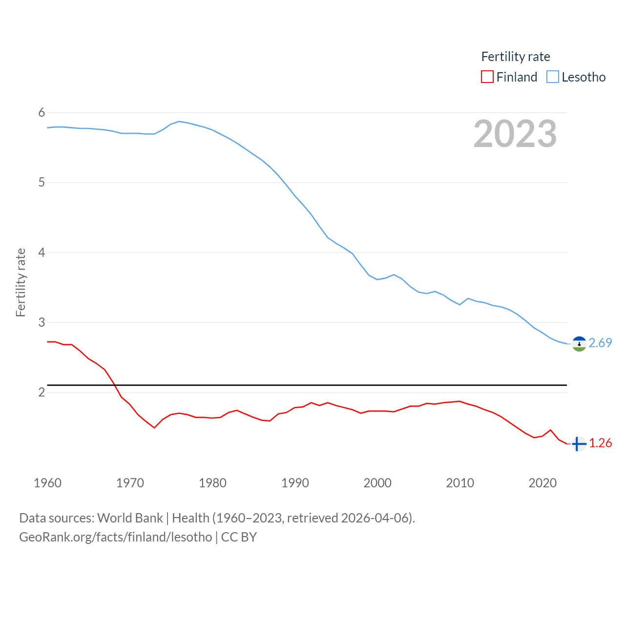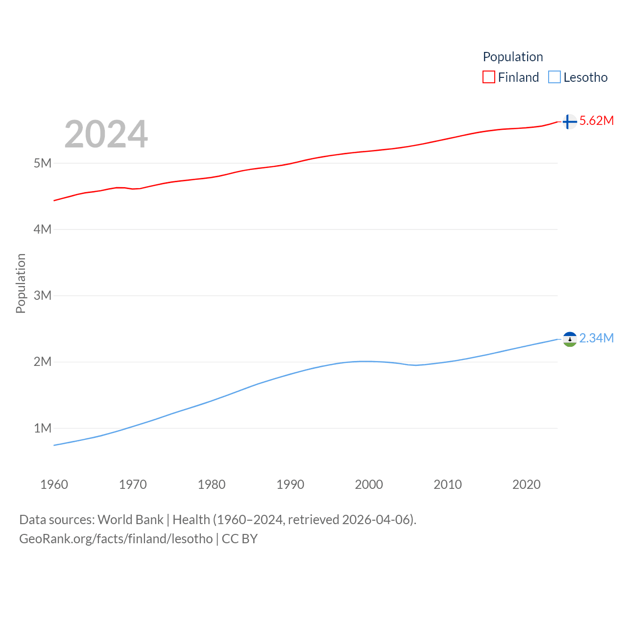 Finland has a population of 5.62M (ranked 116/197), compared with 2.34M in Lesotho (ranked 145/197). Finland's land area is 117,360 sq mi versus 11,722 sq mi for Lesotho (ranked 70th vs. 137th).