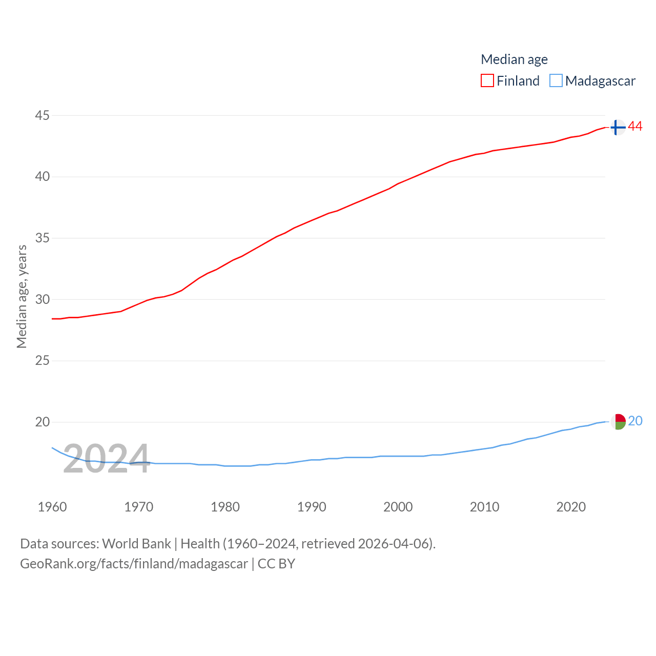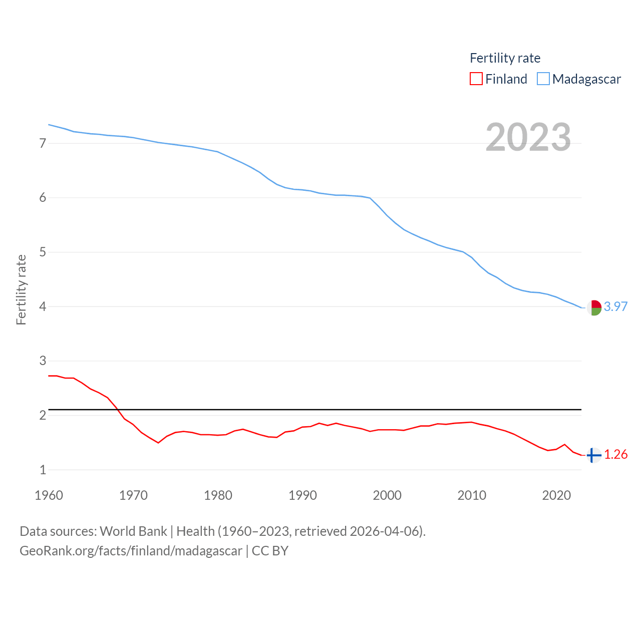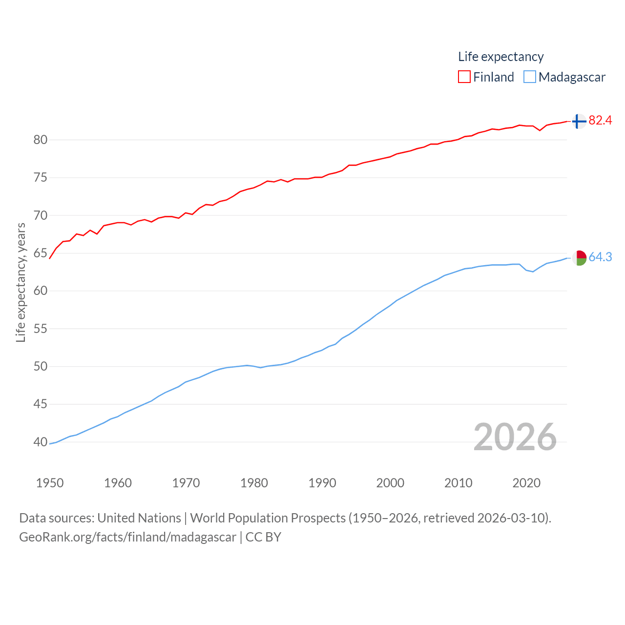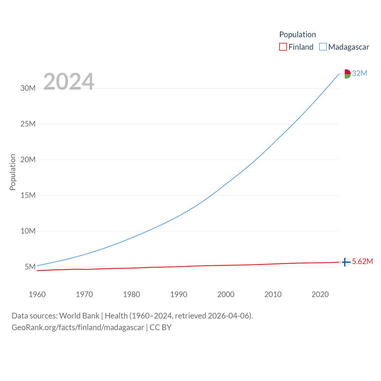 Finland has a population of 5.62M (ranked 116/197), compared with 32M in Madagascar (ranked 49/197). Finland's land area is 117,360 sq mi versus 224,634 sq mi for Madagascar (ranked 70th vs. 44th).