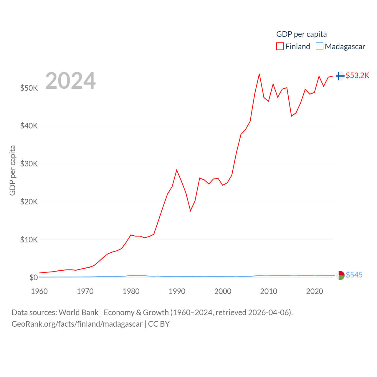 By GDP, Finland ranks 47/197 ($299B) and Madagascar ranks 136/197 ($17.4B). By GDP per capita, Finland ranks 23/197 ($53,150), while Madagascar ranks 193/197 ($545).