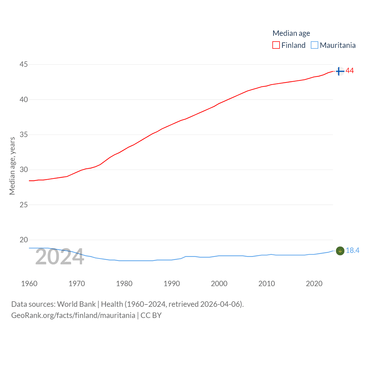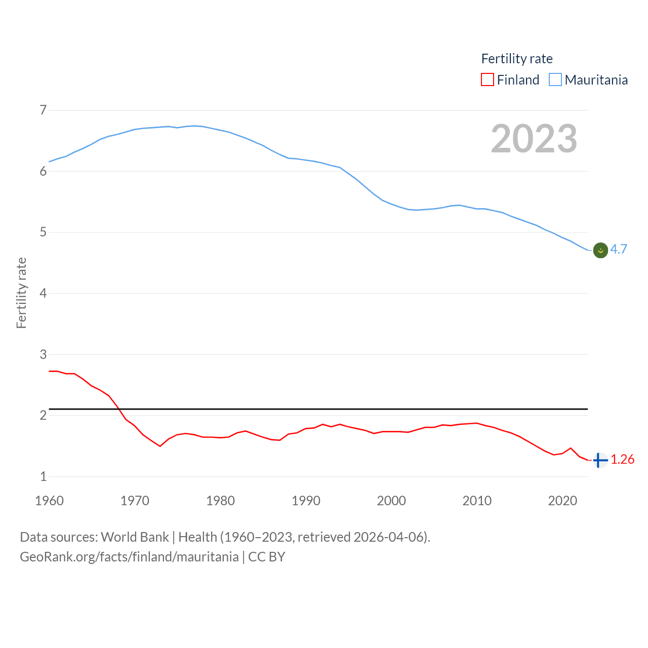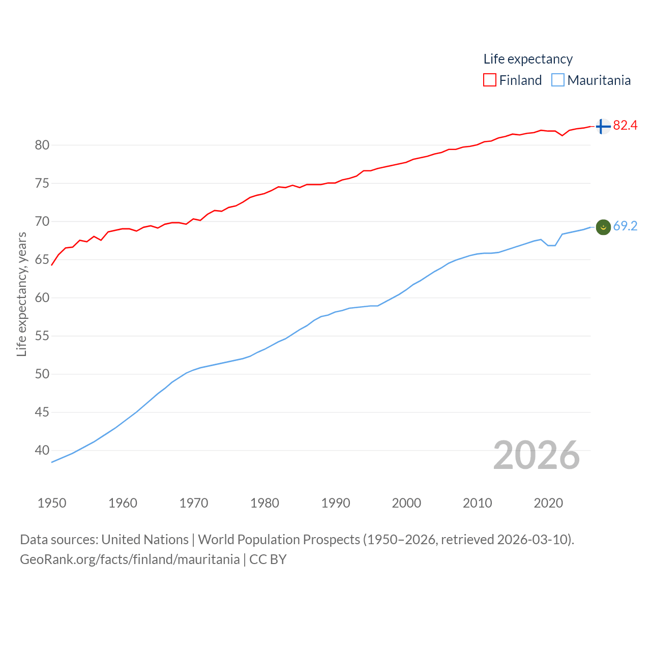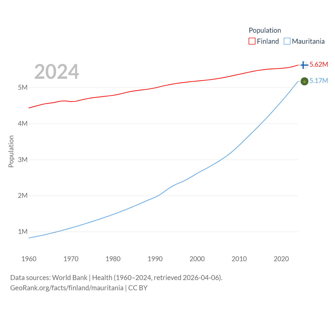 Finland has a population of 5.62M (ranked 116/197), compared with 5.17M in Mauritania (ranked 125/197). Finland's land area is 117,360 sq mi versus 397,955 sq mi for Mauritania (ranked 70th vs. 28th).