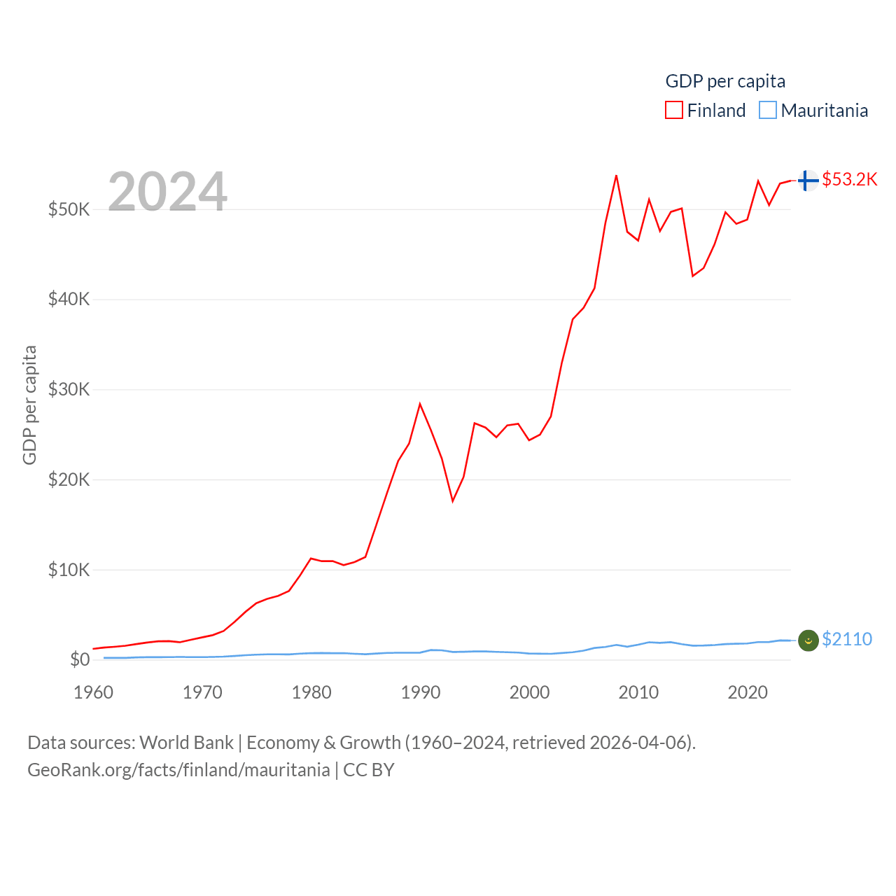 By GDP, Finland ranks 47/197 ($299B) and Mauritania ranks 153/197 ($10.9B). By GDP per capita, Finland ranks 23/197 ($53,150), while Mauritania ranks 156/197 ($2,110).