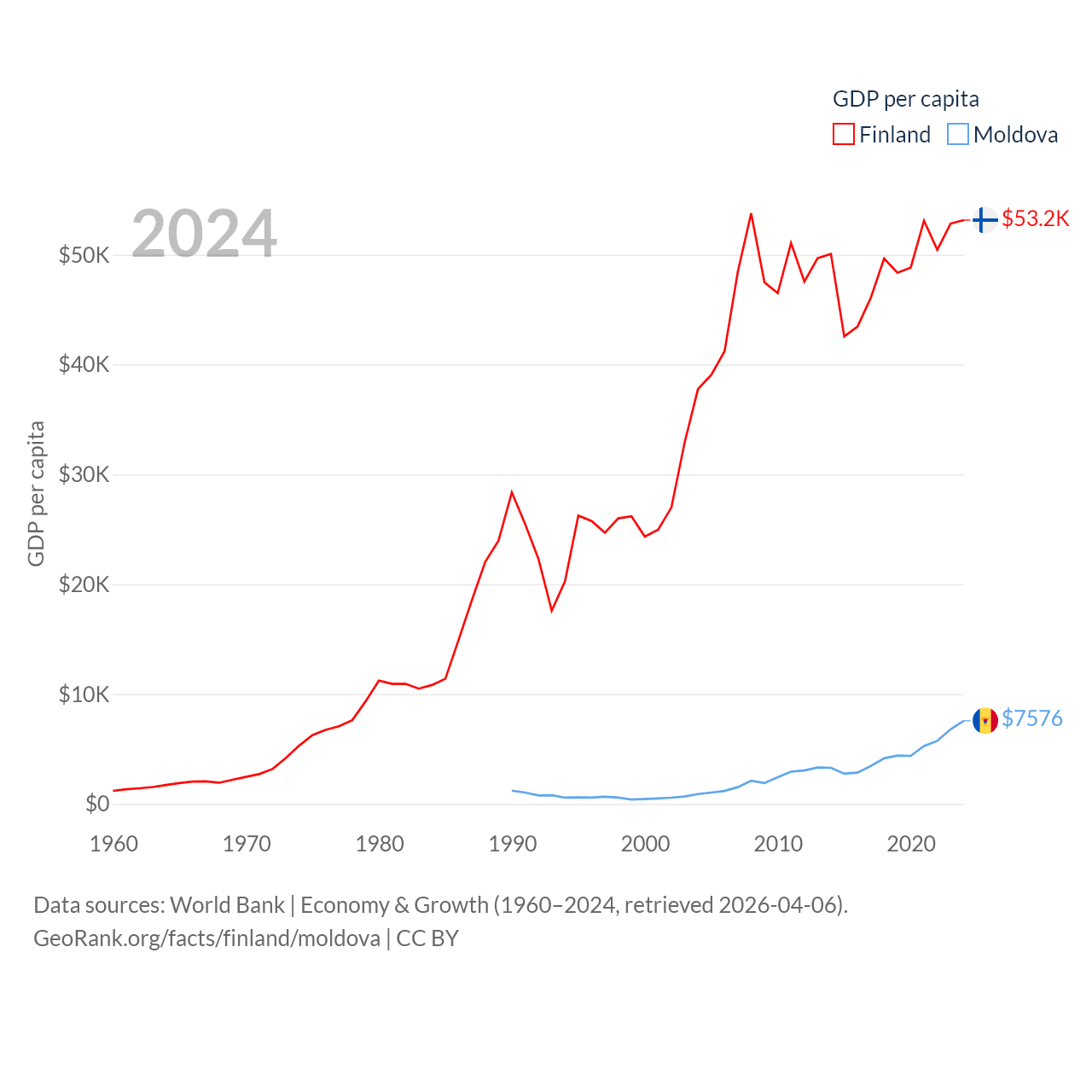 By GDP, Finland ranks 47/197 ($299B) and Moldova ranks 134/197 ($18.2B). By GDP per capita, Finland ranks 23/197 ($53,150), while Moldova ranks 99/197 ($7,576).