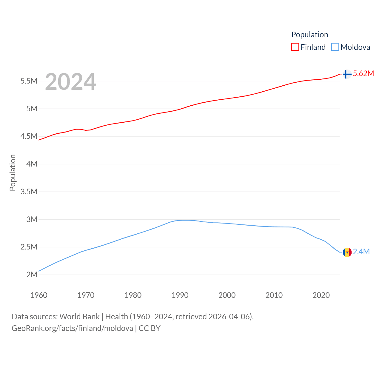 Finland has a population of 5.62M (ranked 116/197), compared with 2.4M in Moldova (ranked 143/197). Finland's land area is 117,360 sq mi versus 12,714 sq mi for Moldova (ranked 70th vs. 135th).
