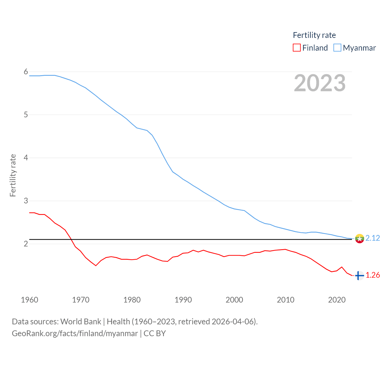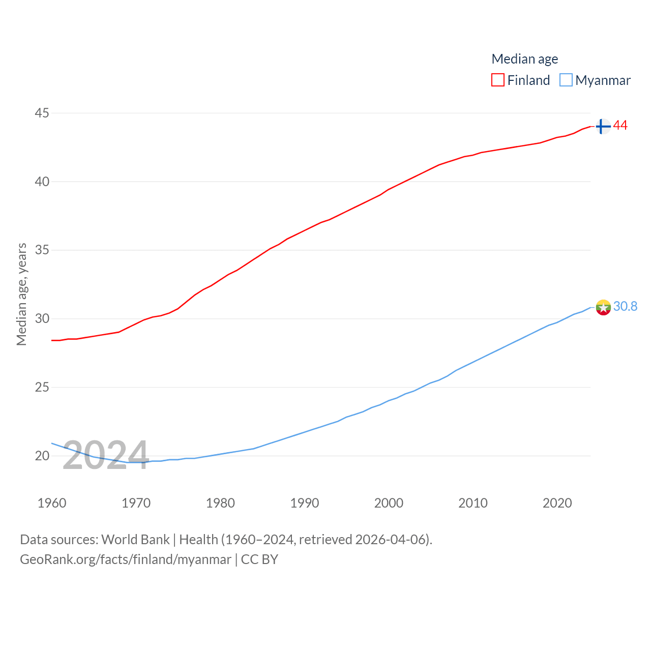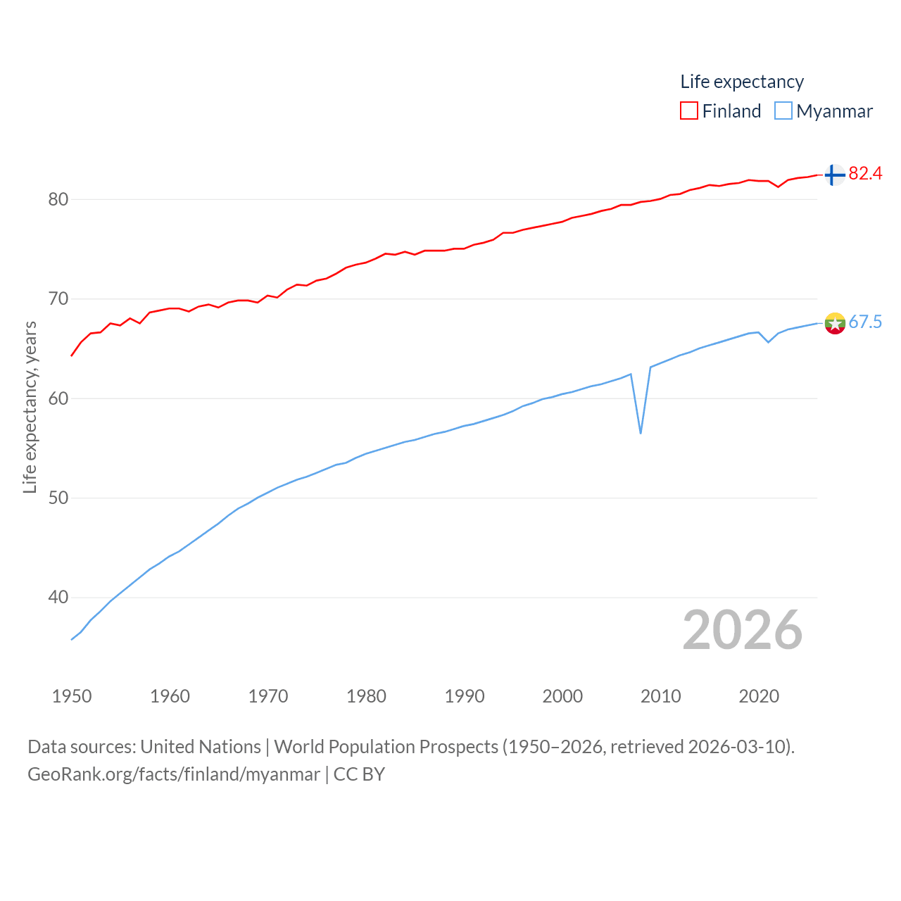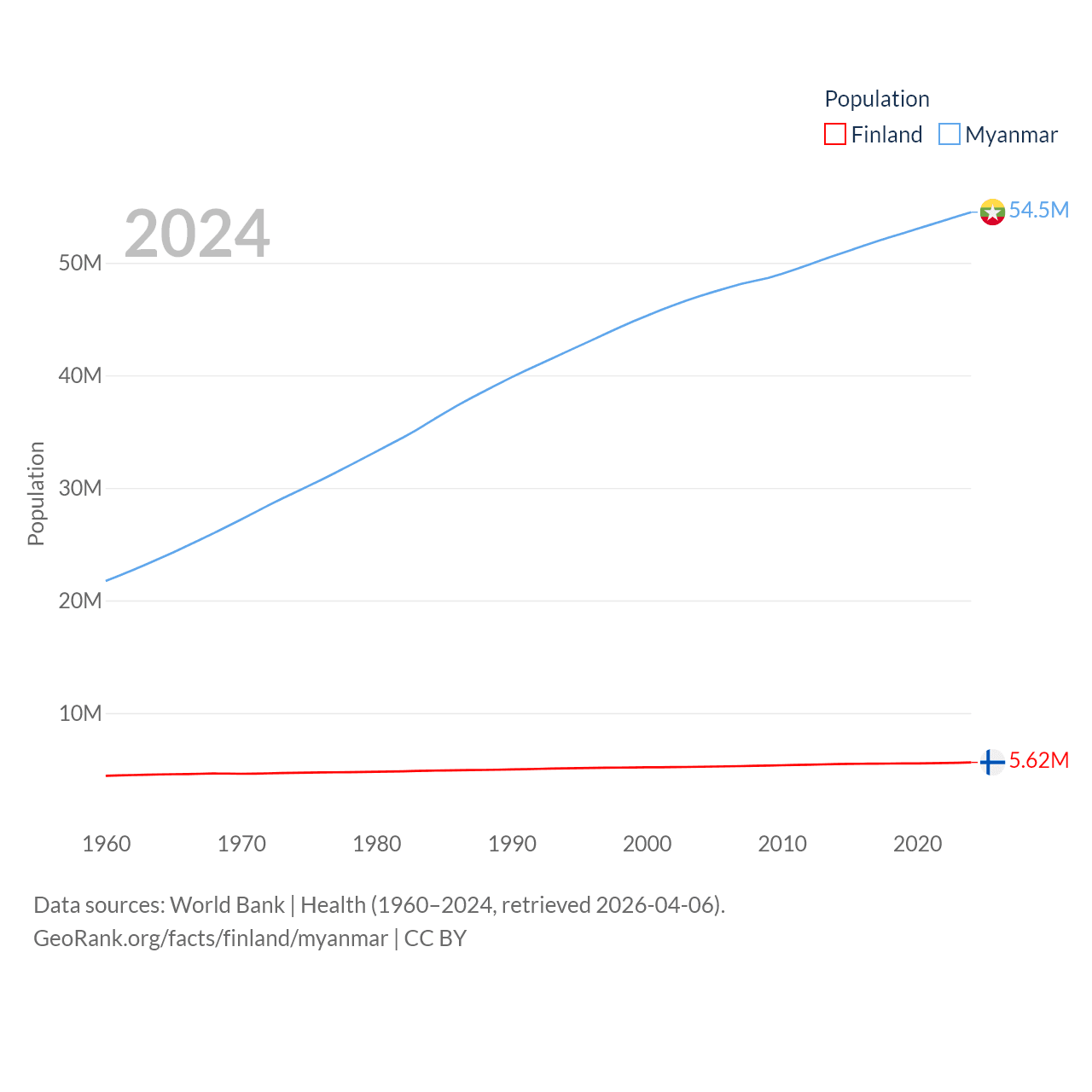 Finland has a population of 5.62M (ranked 116/197), compared with 54.5M in Myanmar (ranked 27/197). Finland's land area is 117,360 sq mi versus 251,997 sq mi for Myanmar (ranked 70th vs. 39th).