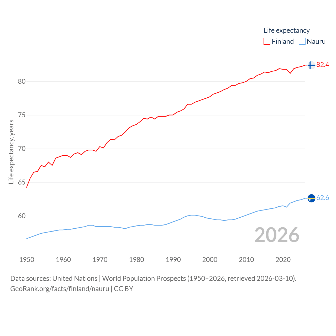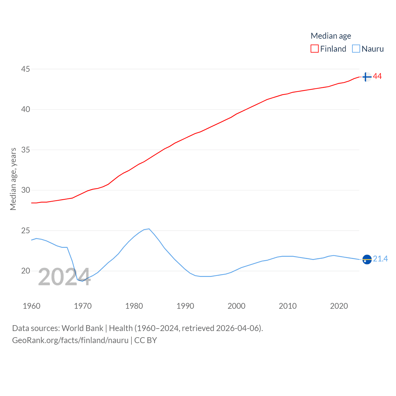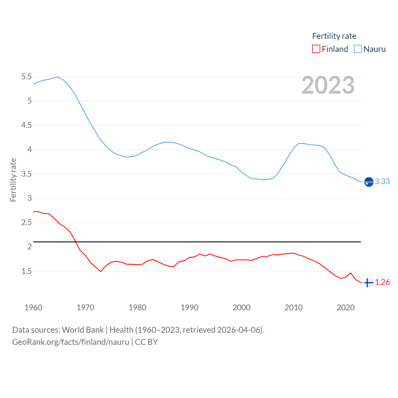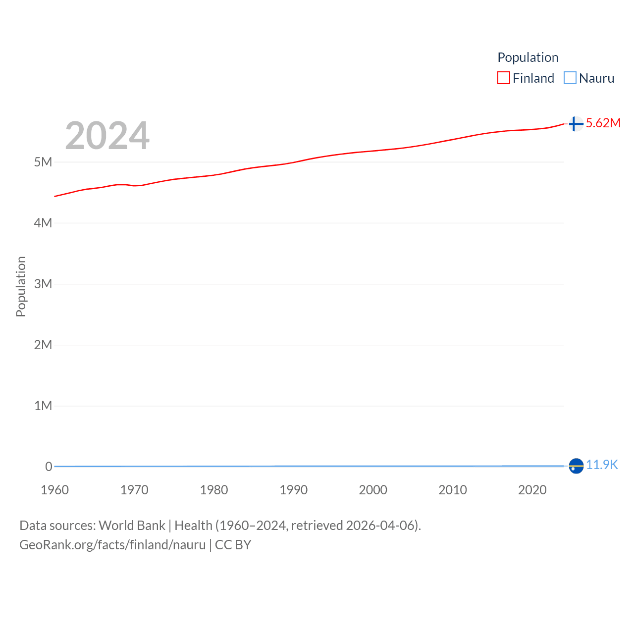 Finland has a population of 5.62M (ranked 116/197), compared with 11.9K in Nauru (ranked 195/197). Finland's land area is 117,360 sq mi versus 7.72 sq mi for Nauru (ranked 70th vs. 195th).