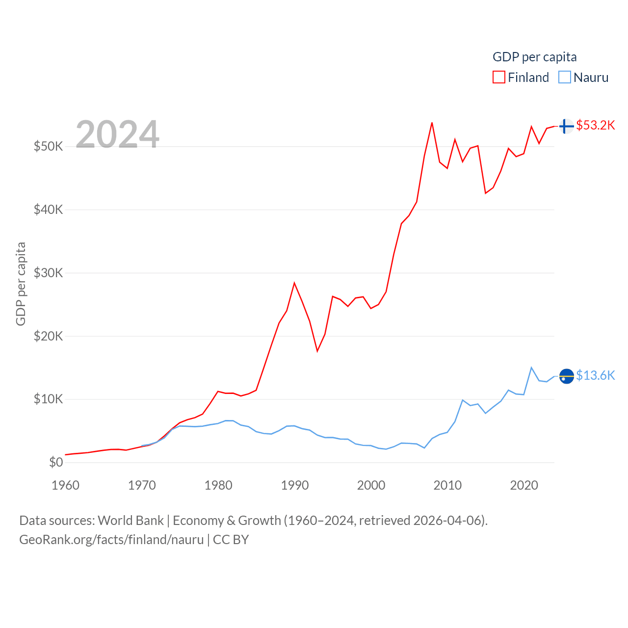 By GDP, Finland ranks 47/197 ($299B) and Nauru ranks 195/197 ($163M). By GDP per capita, Finland ranks 23/197 ($53,150), while Nauru ranks 74/197 ($13,609).