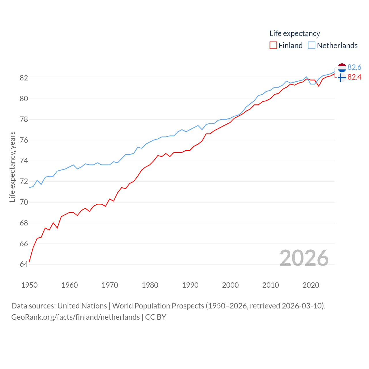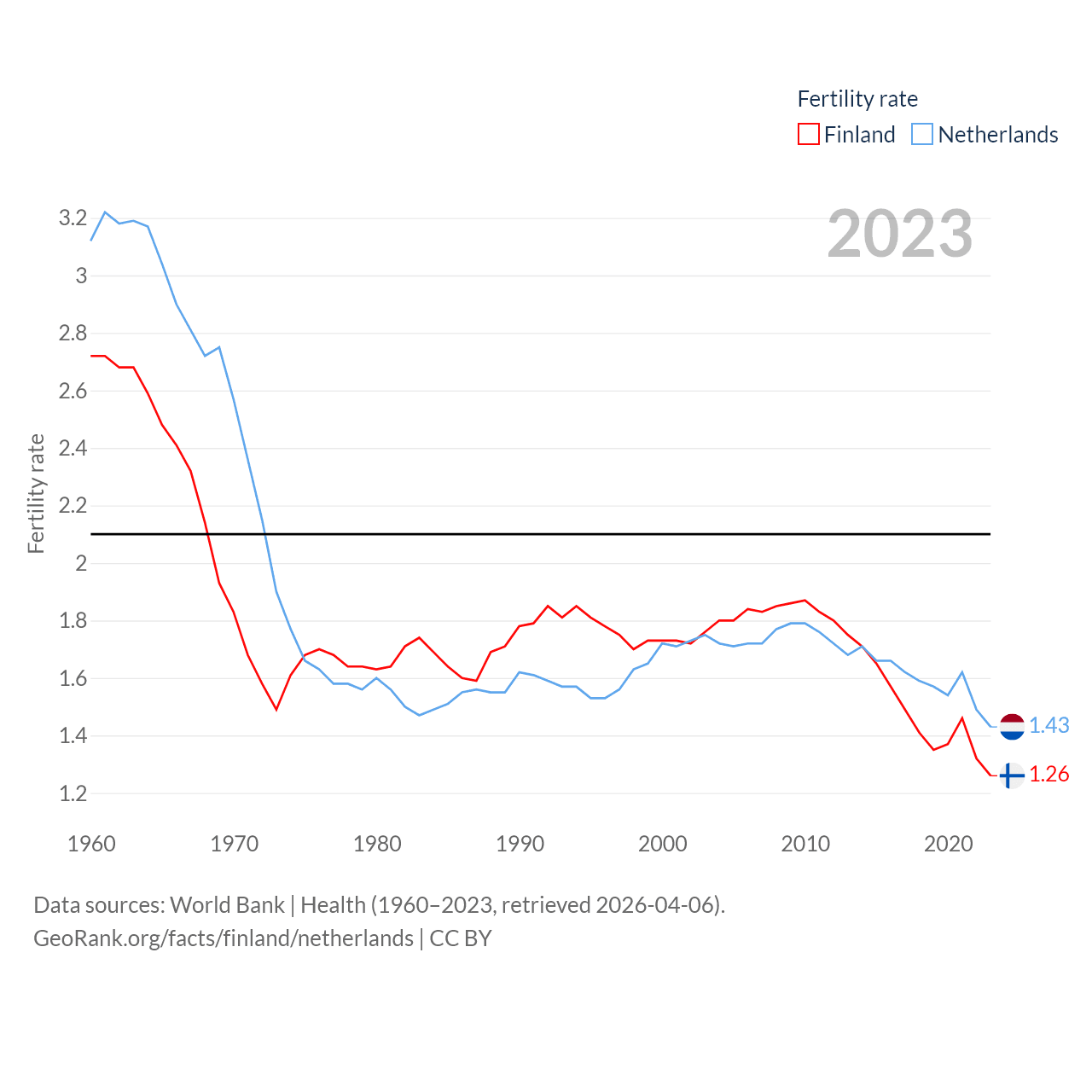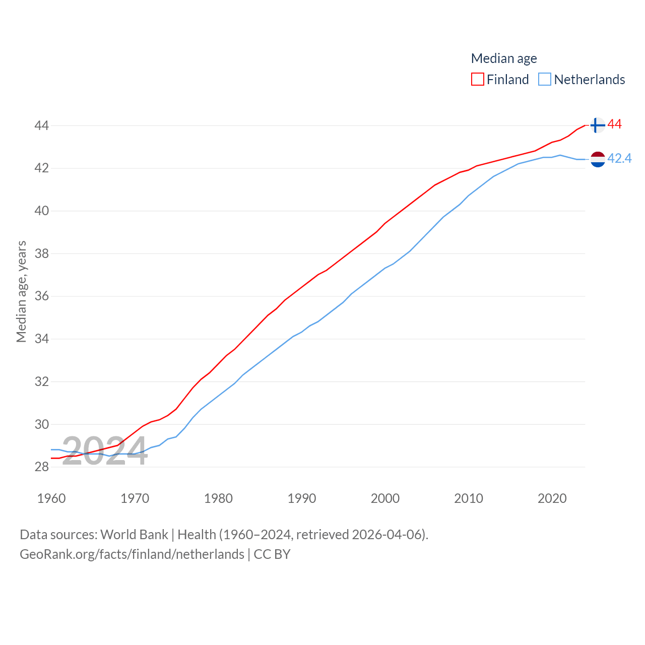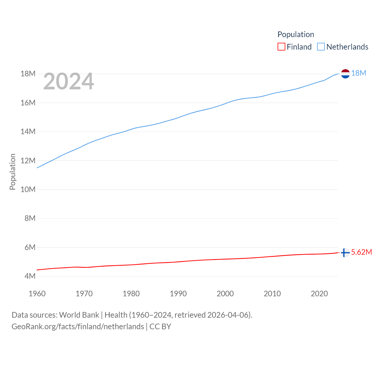 Finland has a population of 5.62M (ranked 116/197), compared with 18M in The Netherlands (ranked 72/197). Finland's land area is 117,360 sq mi versus 13,000 sq mi for The Netherlands (ranked 70th vs. 134th).