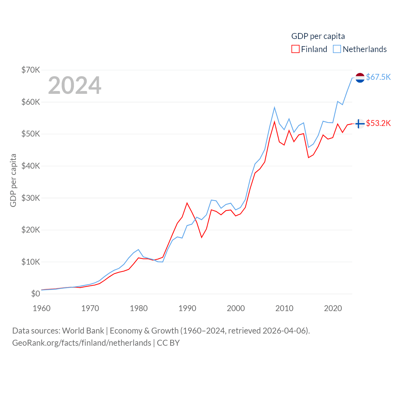 By GDP, Finland ranks 47/197 ($299B) and The Netherlands ranks 19/197 ($1.21T). By GDP per capita, Finland ranks 23/197 ($53,150), while The Netherlands ranks 13/197 ($67,520).