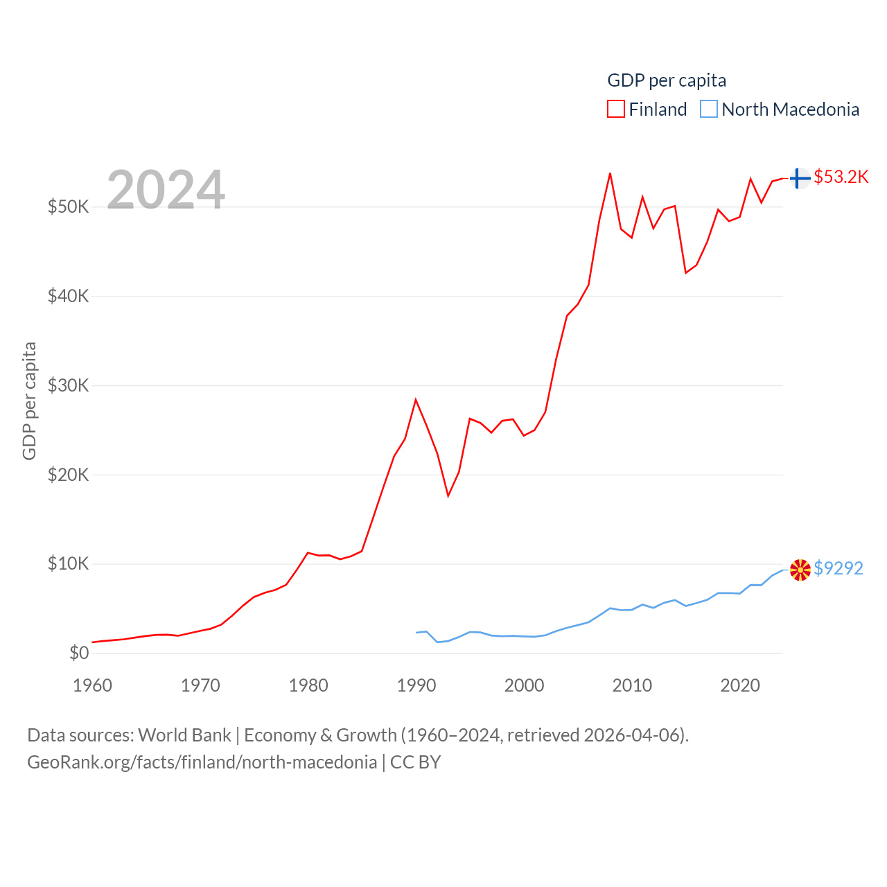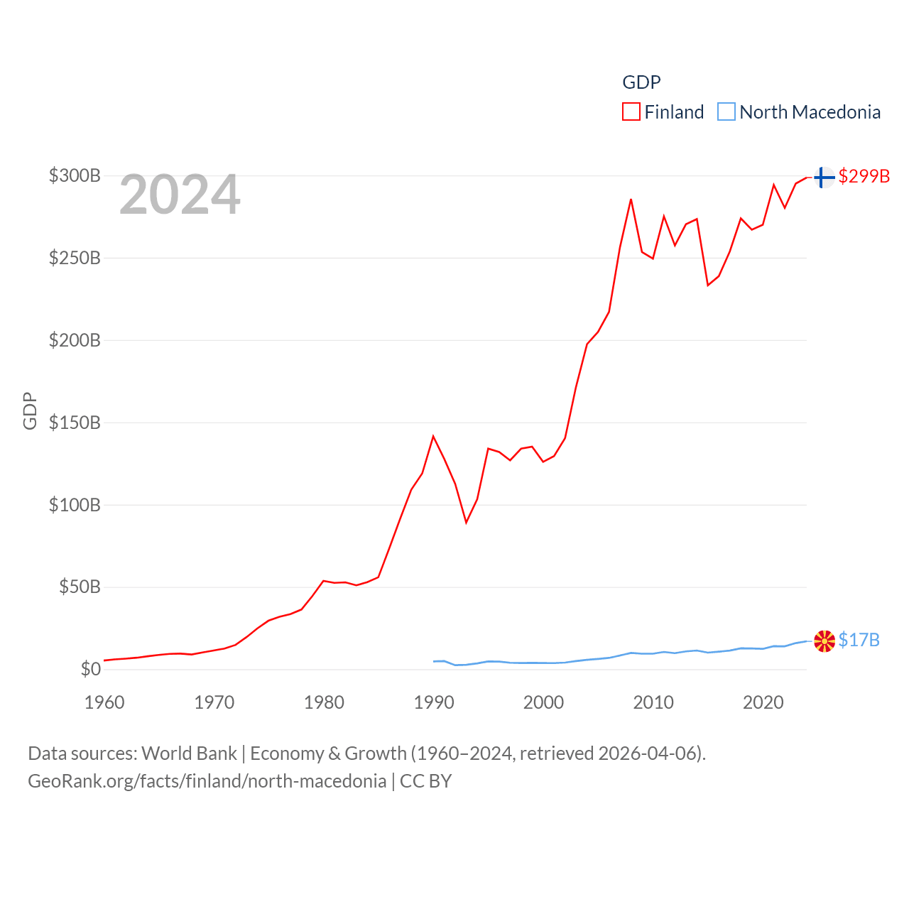 By GDP, Finland ranks 47/197 ($299B) and North Macedonia ranks 138/197 ($17B). By GDP per capita, Finland ranks 23/197 ($53,150), while North Macedonia ranks 88/197 ($9,292).