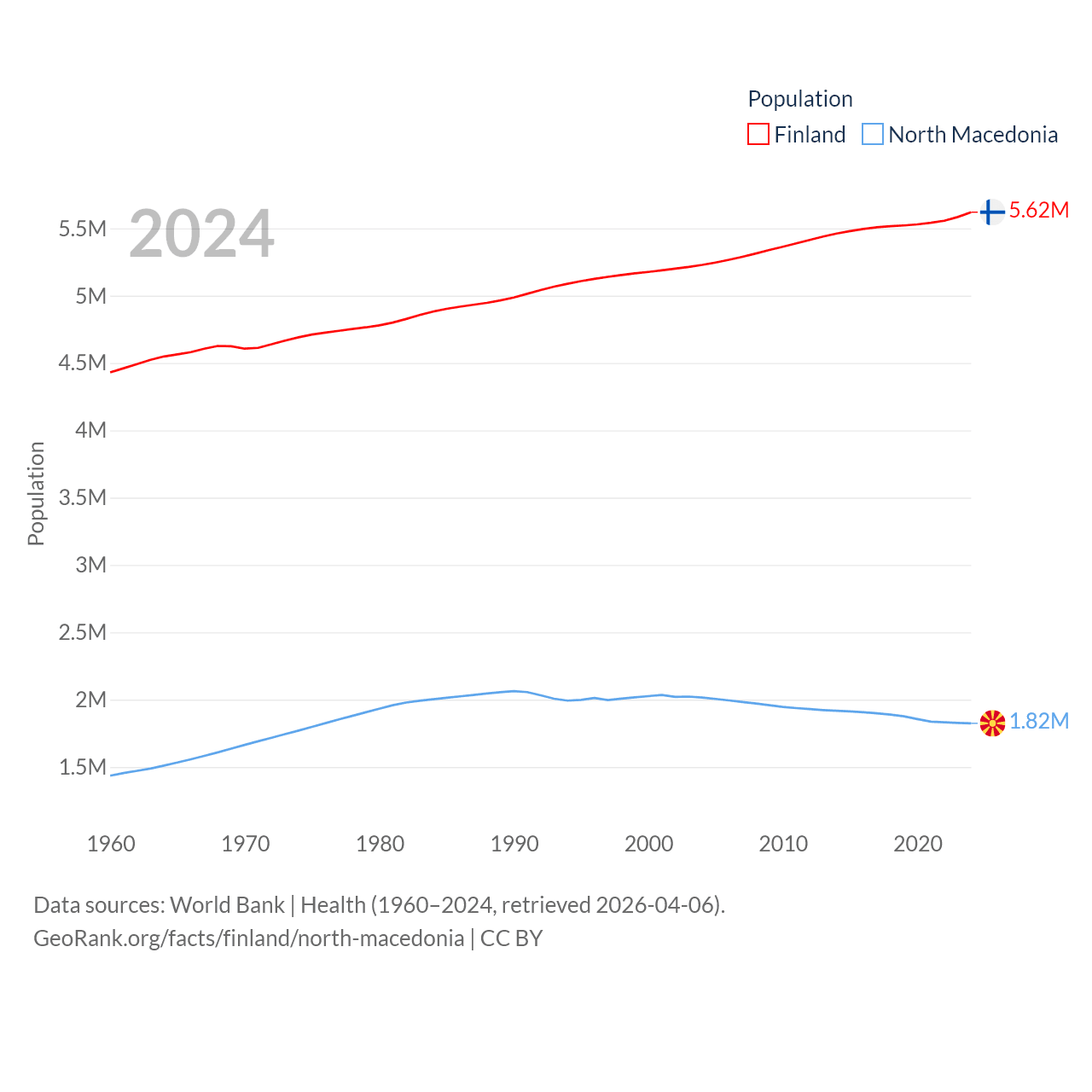 Finland has a population of 5.62M (ranked 116/197), compared with 1.82M in North Macedonia (ranked 150/197). Finland's land area is 117,360 sq mi versus 9,737 sq mi for North Macedonia (ranked 70th vs. 145th).