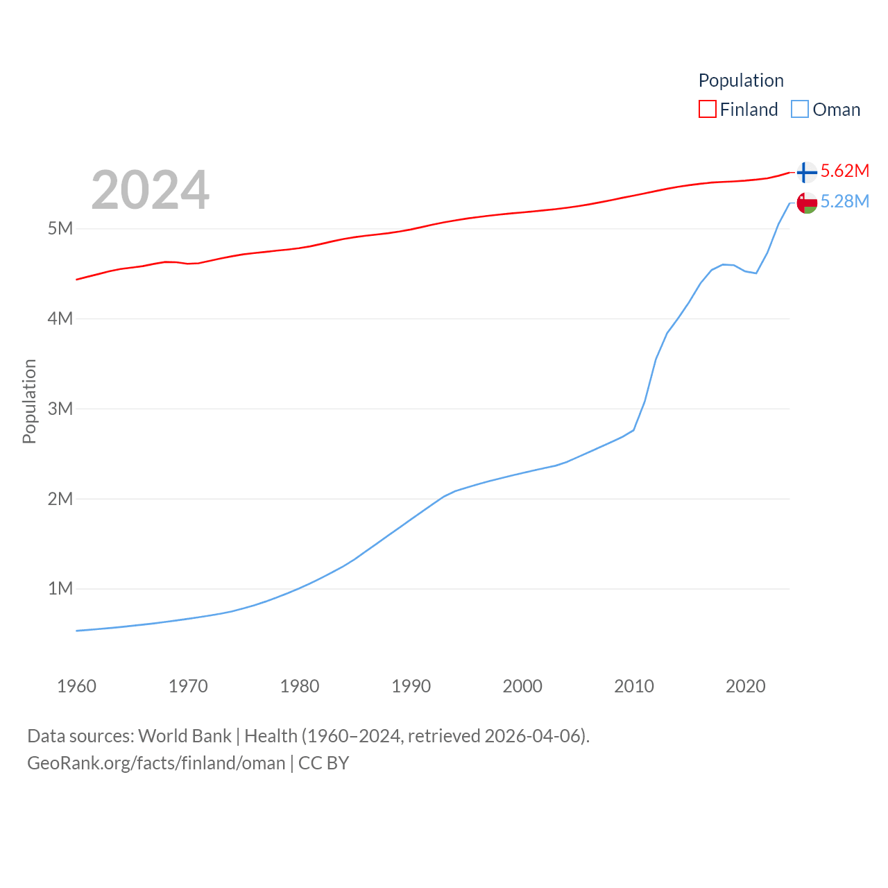 Finland has a population of 5.62M (ranked 116/197), compared with 5.28M in Oman (ranked 124/197). Finland's land area is 117,360 sq mi versus 119,499 sq mi for Oman (ranked 70th vs. 68th).
