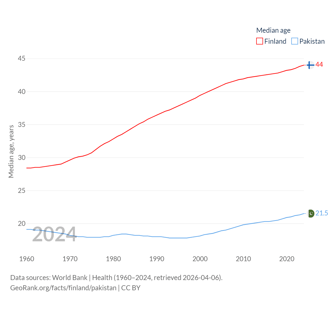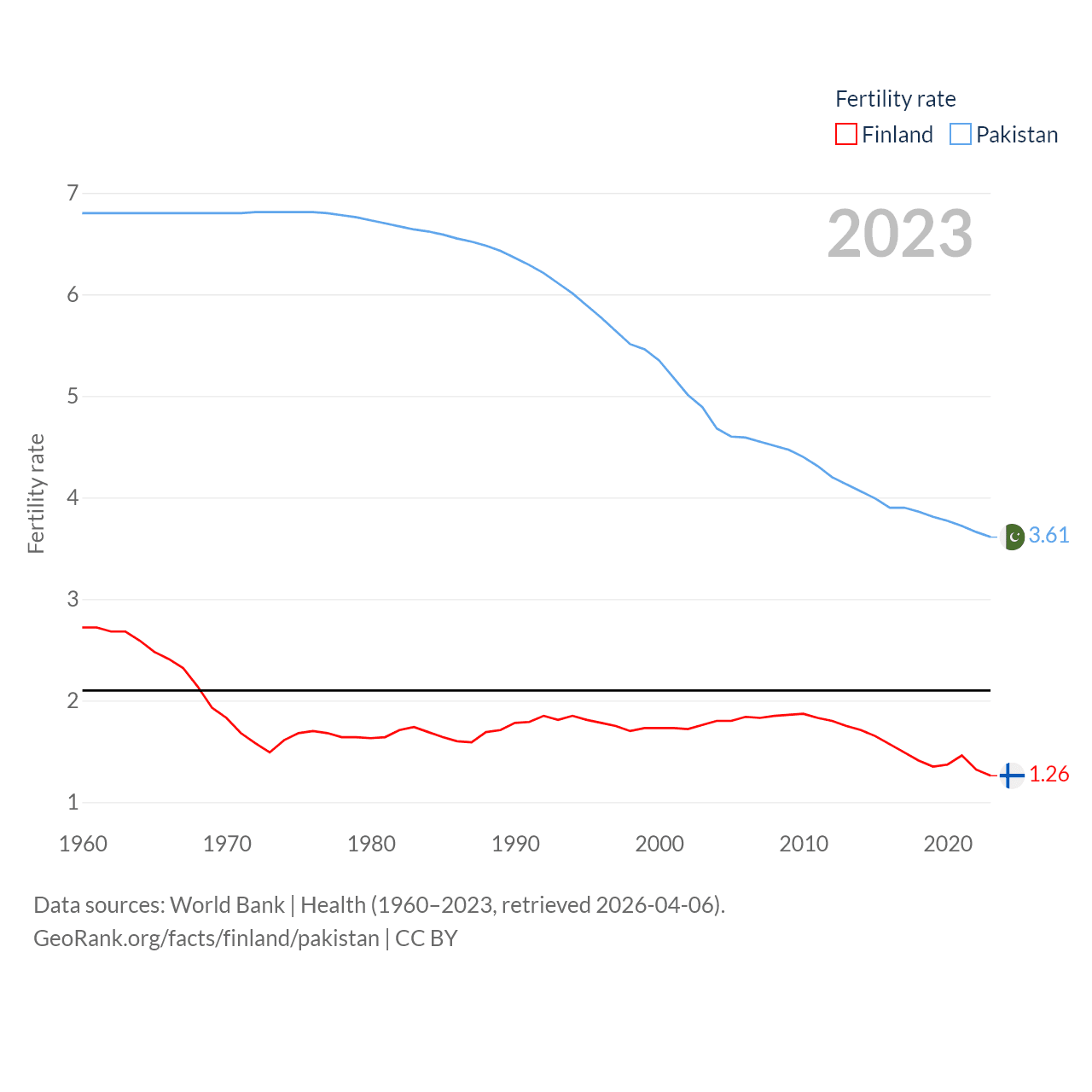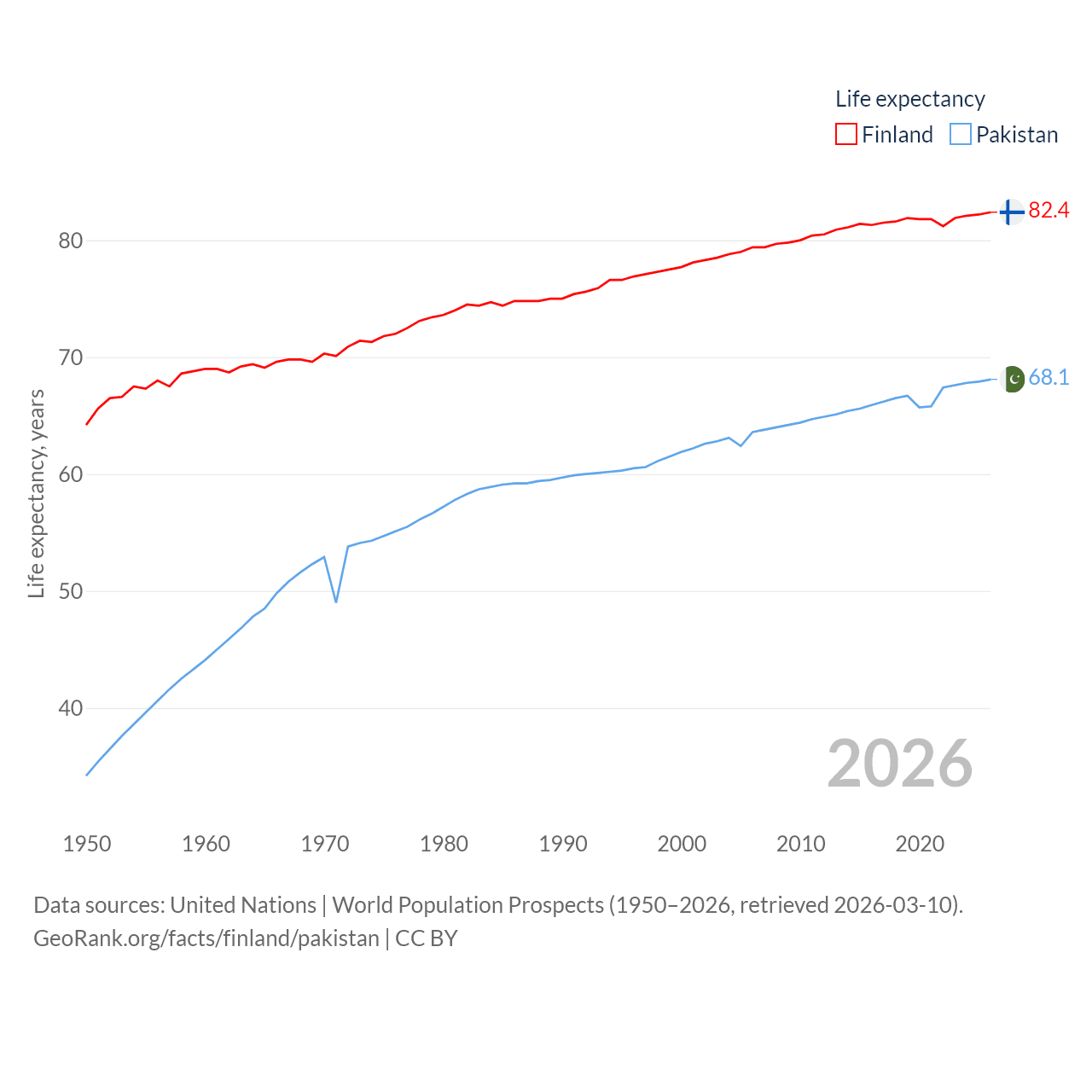 Finland has a population of 5.62M (ranked 116/197), compared with 251M in Pakistan (ranked 5/197). Finland's land area is 117,360 sq mi versus 297,638 sq mi for Pakistan (ranked 70th vs. 35th).