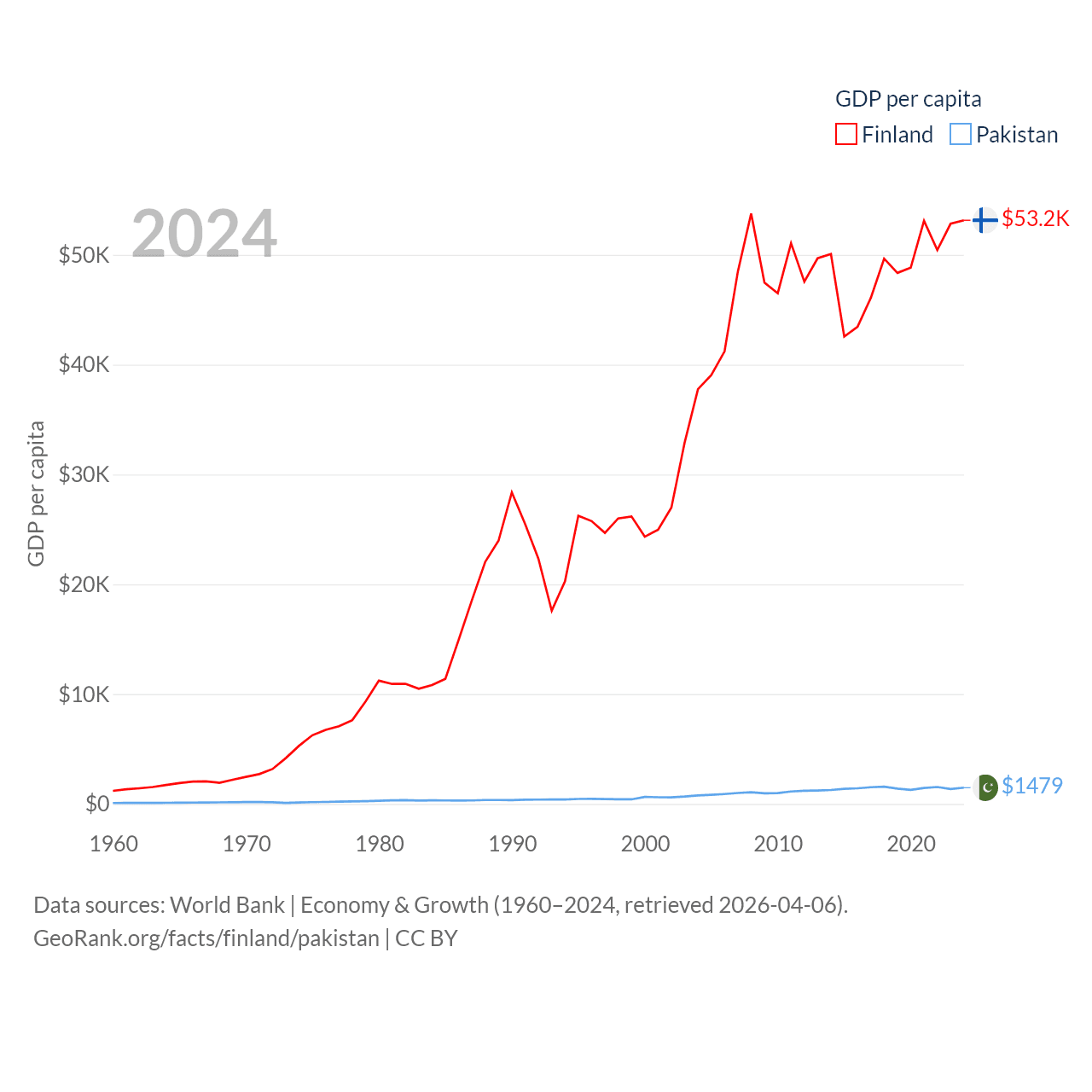 By GDP, Finland ranks 47/197 ($299B) and Pakistan ranks 43/197 ($372B). By GDP per capita, Finland ranks 23/197 ($53,150), while Pakistan ranks 163/197 ($1,479).