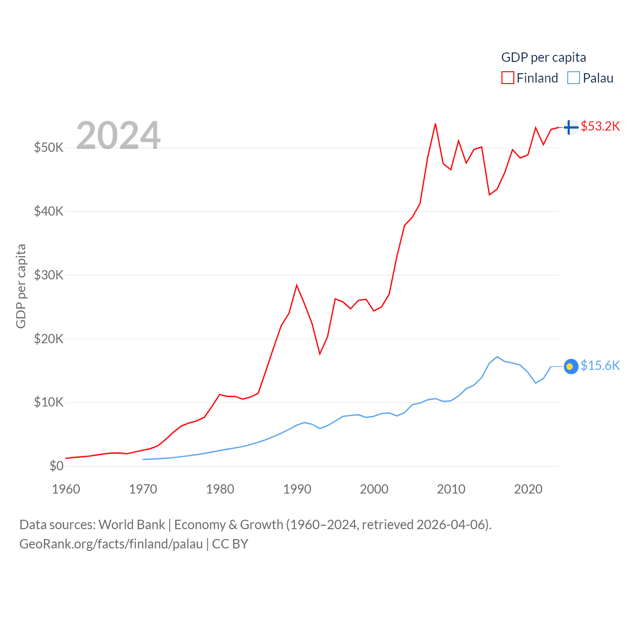 By GDP, Finland ranks 47/197 ($299B) and Palau ranks 194/197 ($277M). By GDP per capita, Finland ranks 23/197 ($53,150), while Palau ranks 67/197 ($15,611).