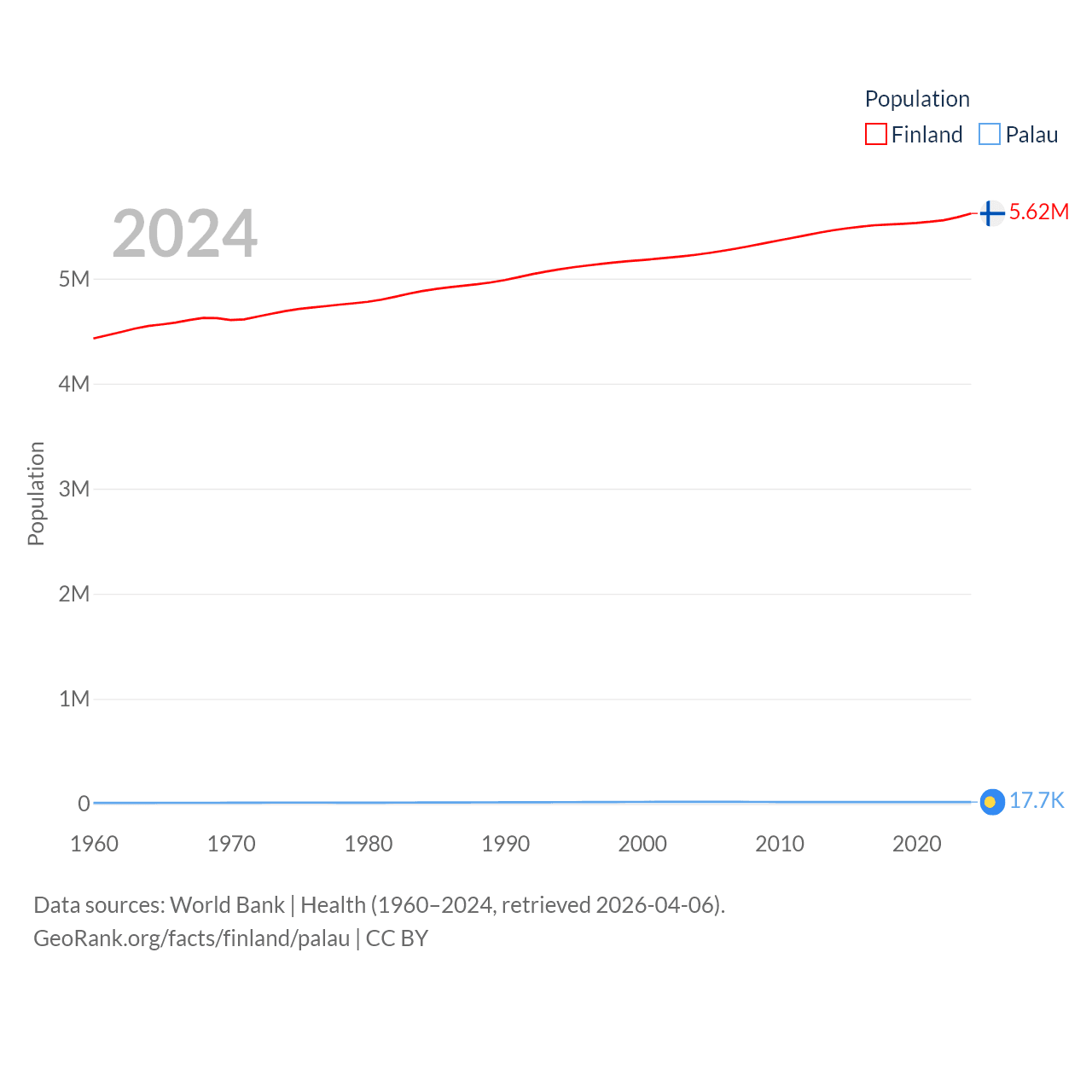Finland has a population of 5.62M (ranked 116/197), compared with 17.7K in Palau (ranked 194/197). Finland's land area is 117,360 sq mi versus 177.6 sq mi for Palau (ranked 70th vs. 180th).