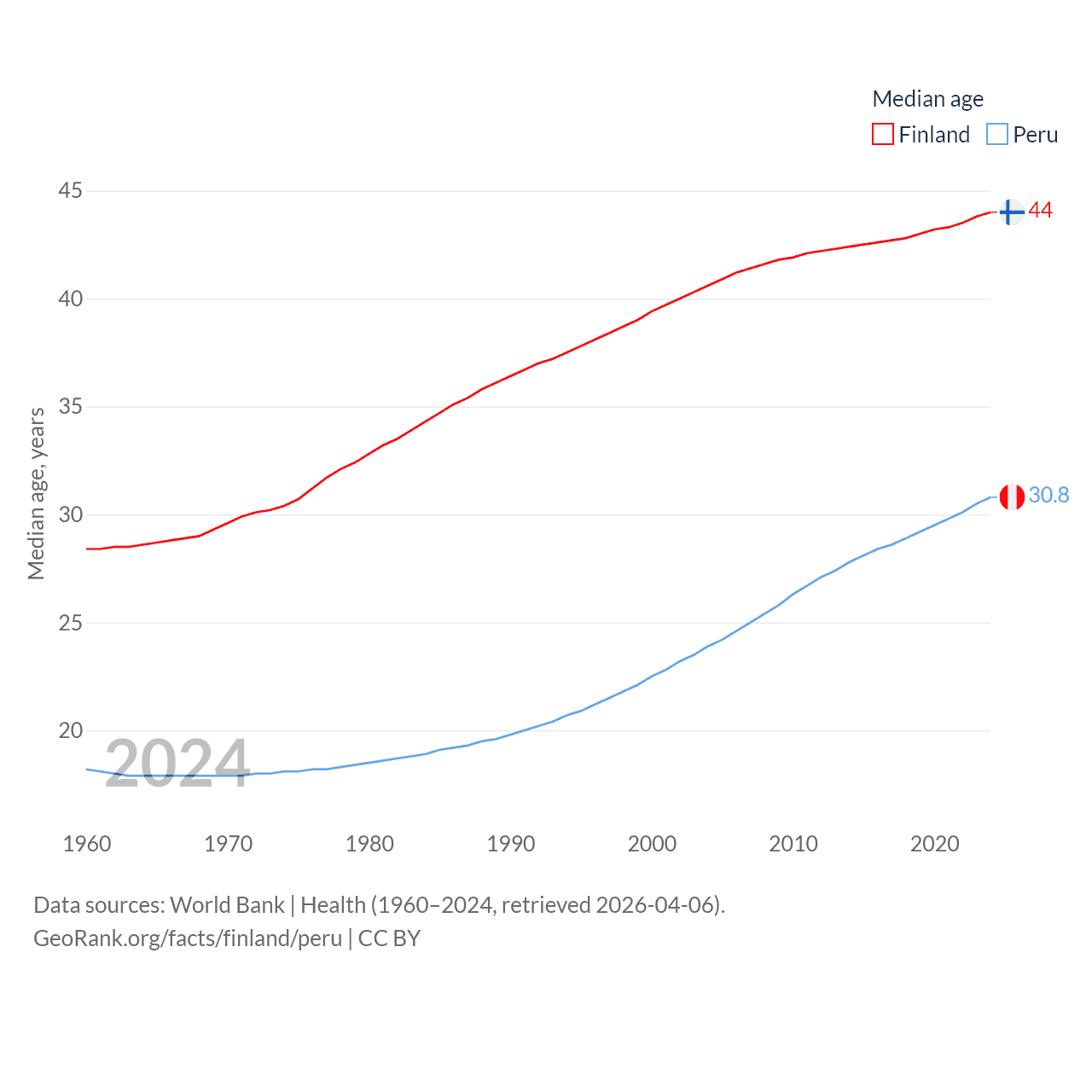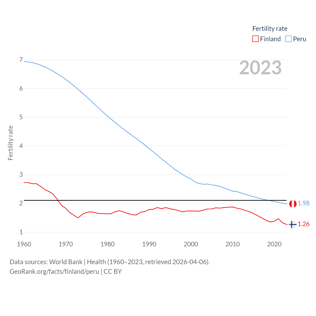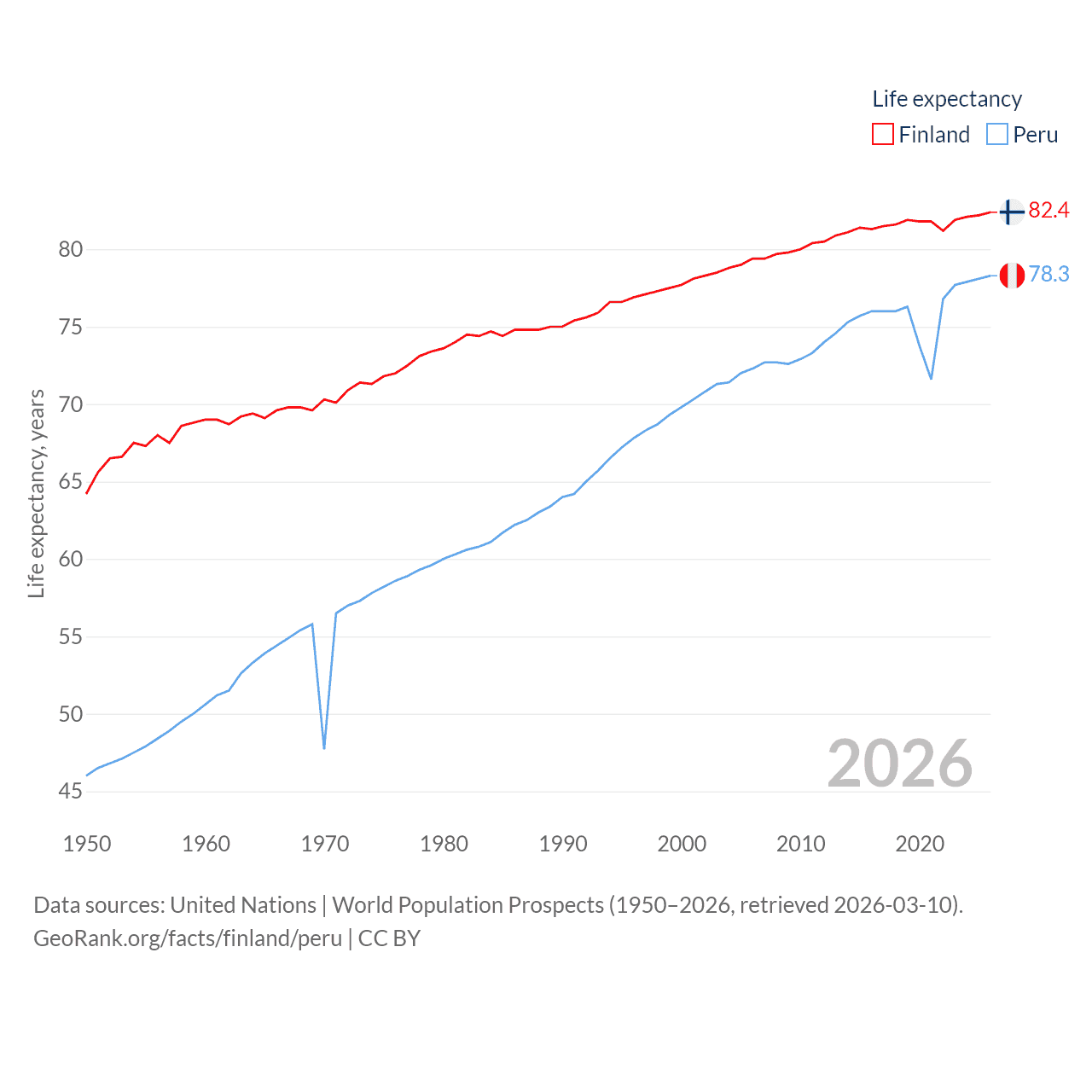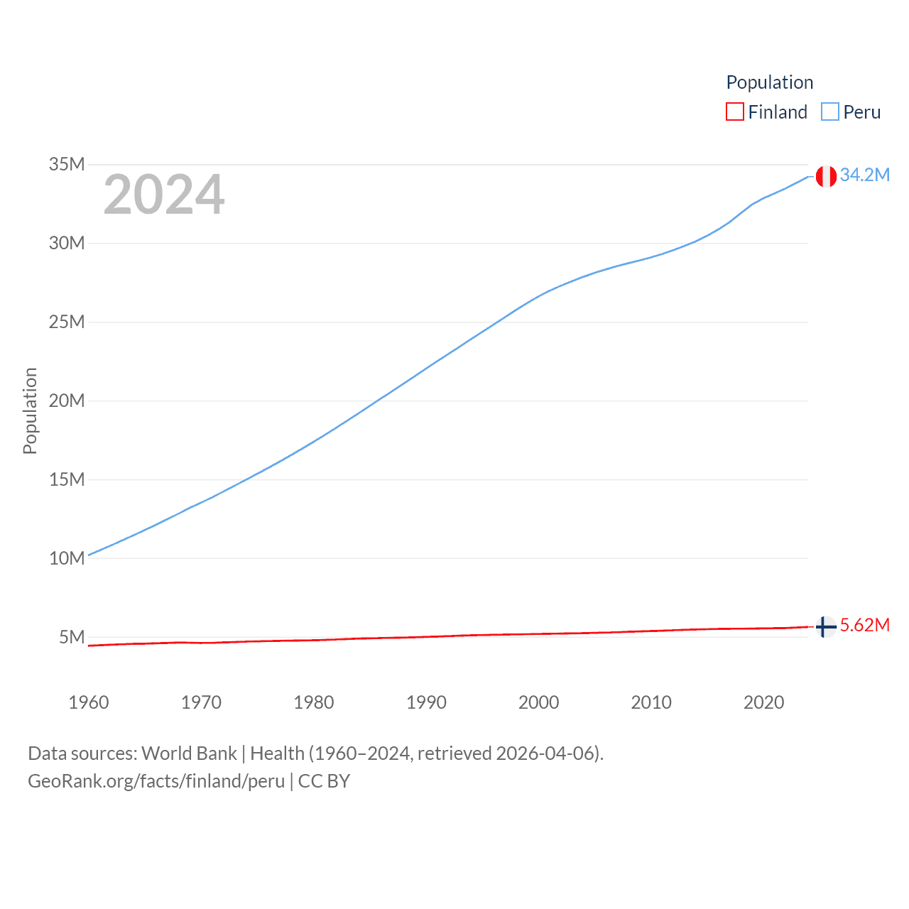 Finland has a population of 5.62M (ranked 116/197), compared with 34.2M in Peru (ranked 48/197). Finland's land area is 117,360 sq mi versus 494,211 sq mi for Peru (ranked 70th vs. 19th).