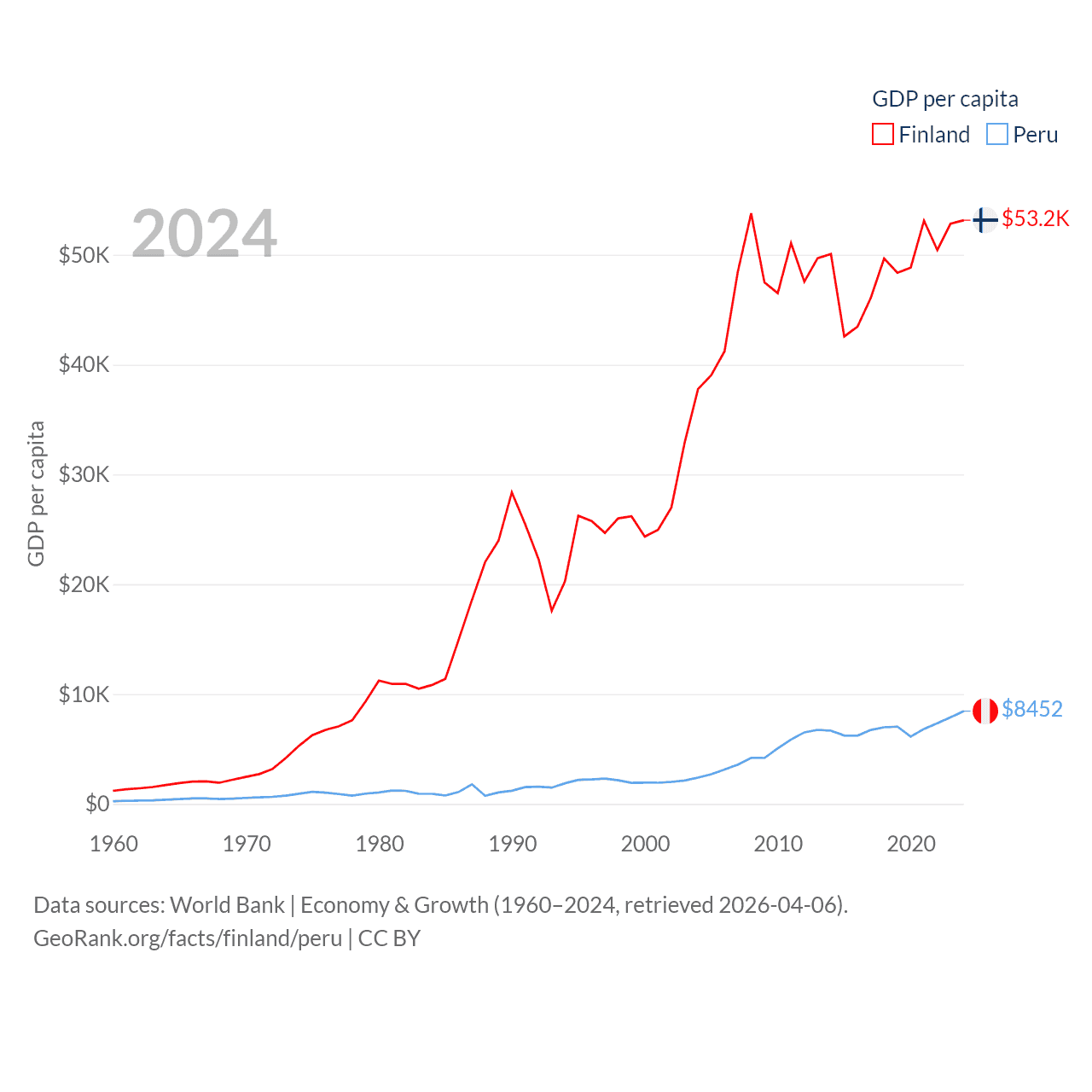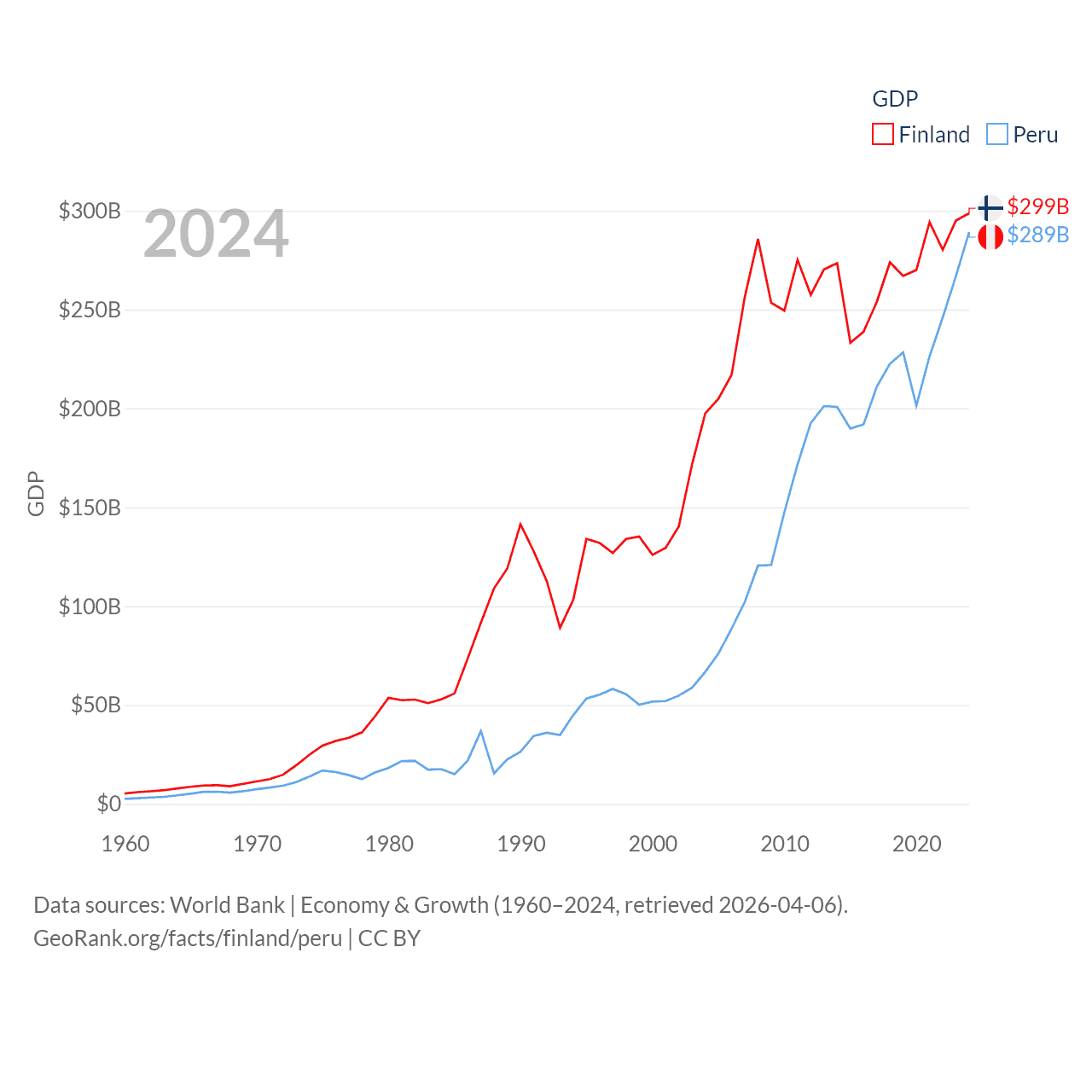 By GDP, Finland ranks 47/197 ($299B) and Peru ranks 49/197 ($289B). By GDP per capita, Finland ranks 23/197 ($53,150), while Peru ranks 91/197 ($8,452).