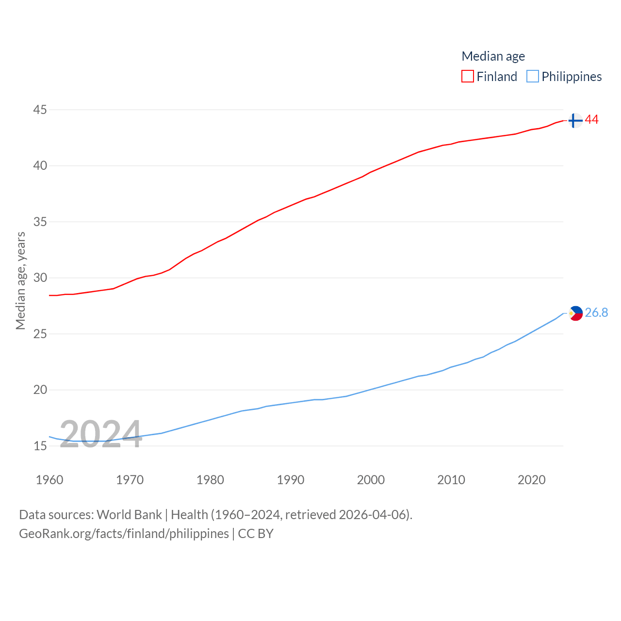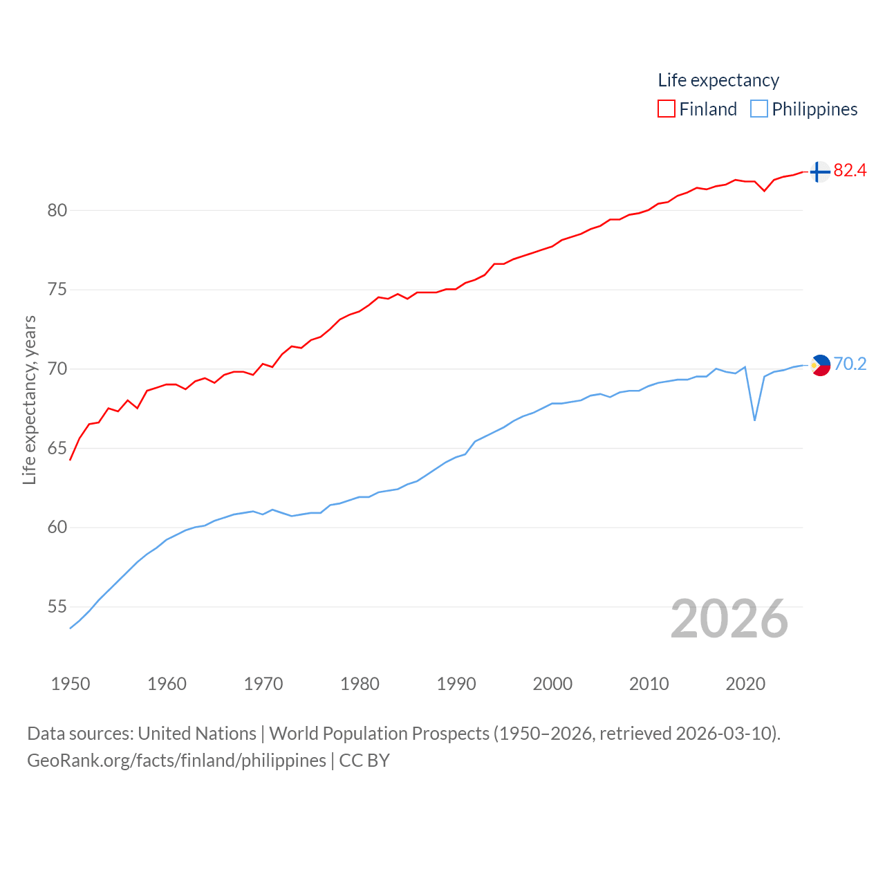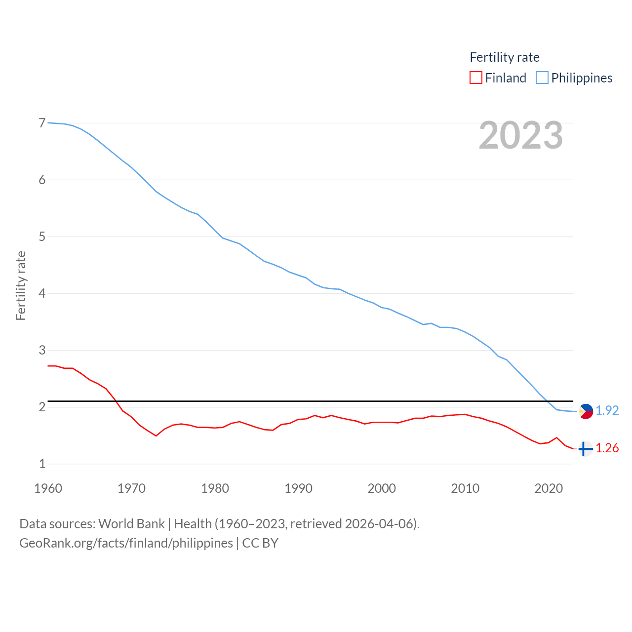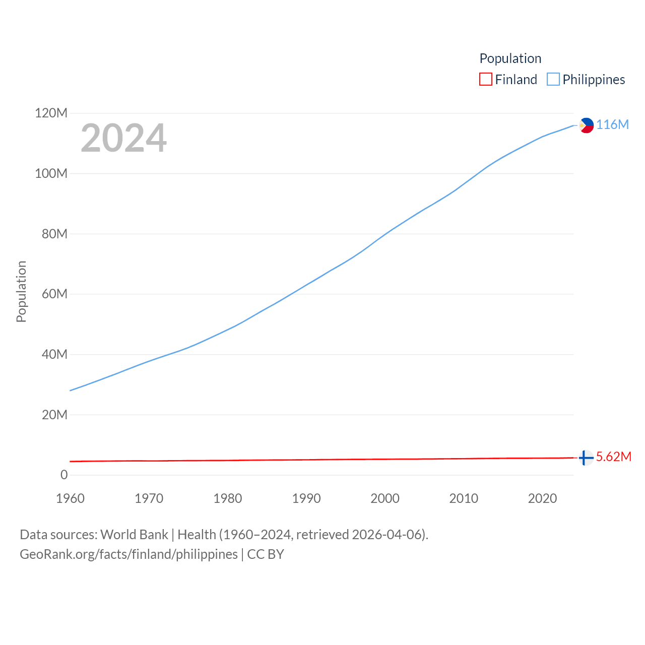 Finland has a population of 5.62M (ranked 116/197), compared with 116M in The Philippines (ranked 14/197). Finland's land area is 117,360 sq mi versus 115,124 sq mi for The Philippines (ranked 70th vs. 71st).