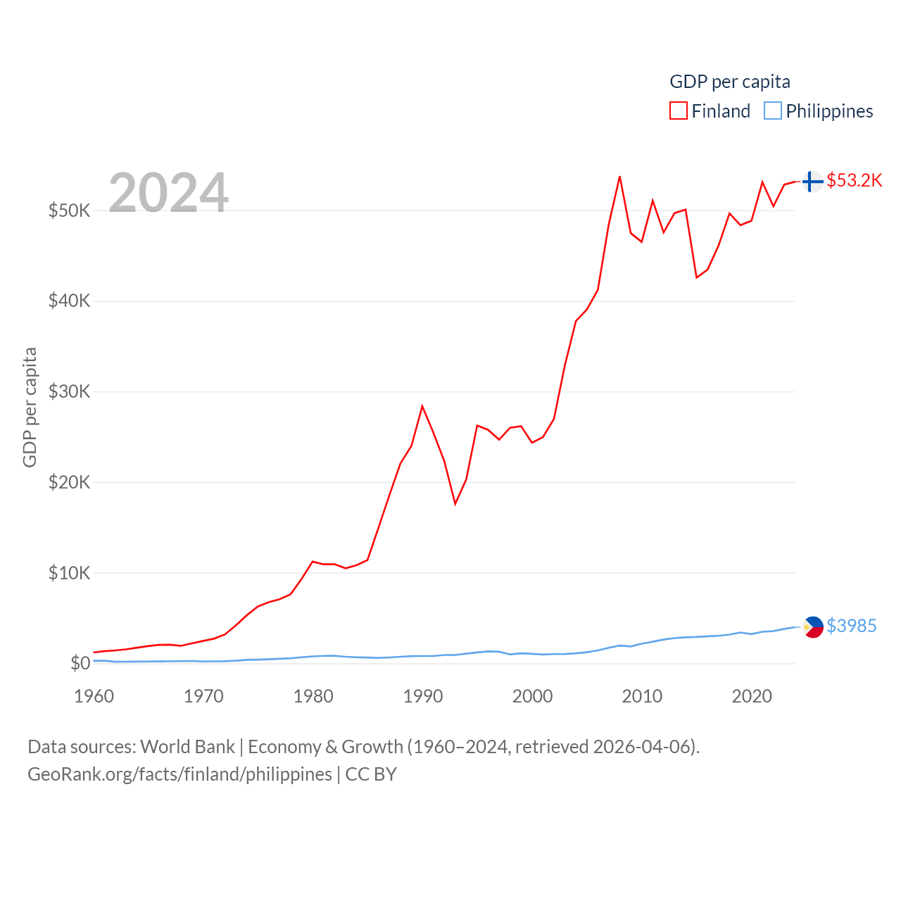 By GDP, Finland ranks 47/197 ($299B) and The Philippines ranks 35/197 ($462B). By GDP per capita, Finland ranks 23/197 ($53,150), while The Philippines ranks 130/197 ($3,985).