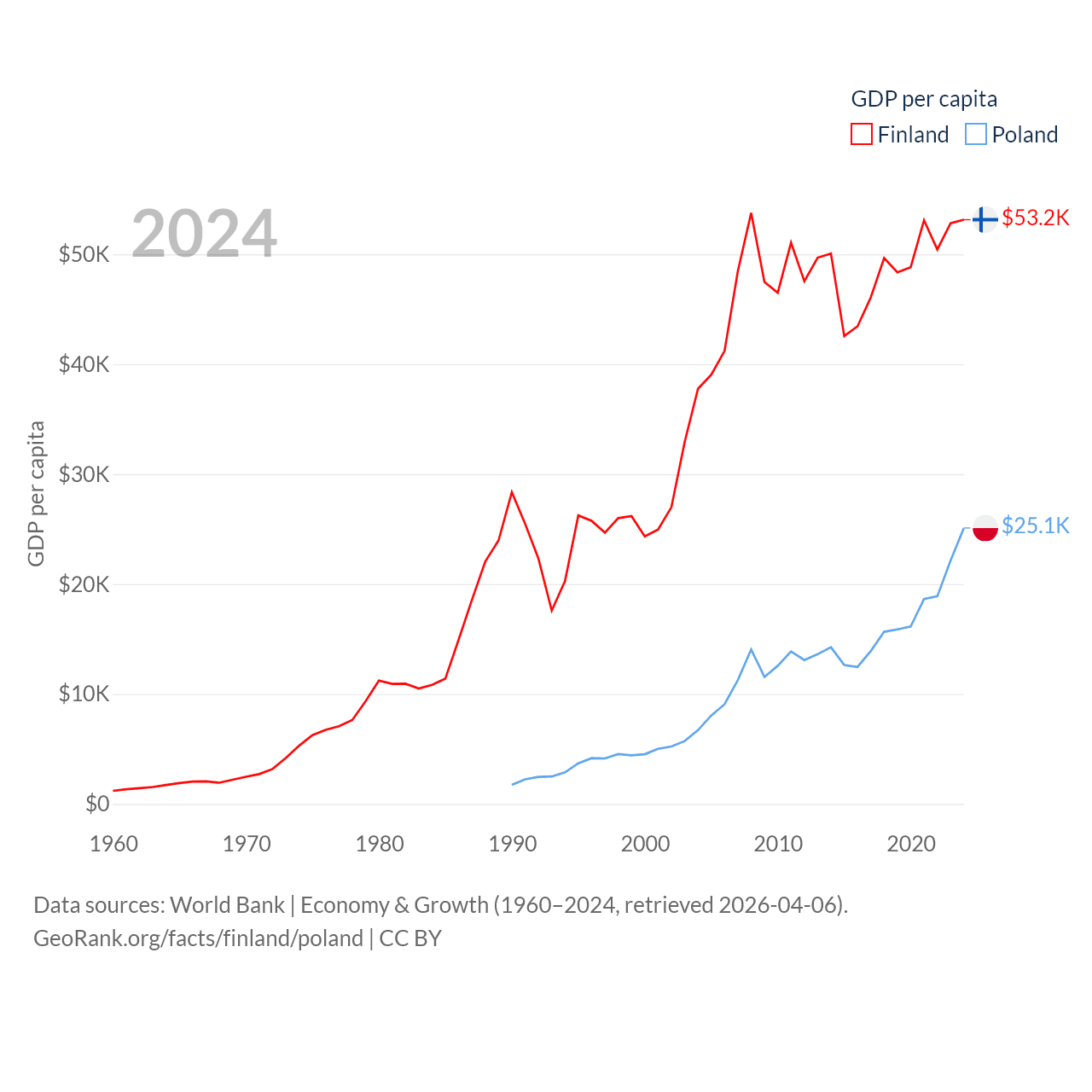 By GDP, Finland ranks 47/197 ($299B) and Poland ranks 21/197 ($918B). By GDP per capita, Finland ranks 23/197 ($53,150), while Poland ranks 48/197 ($25,104).