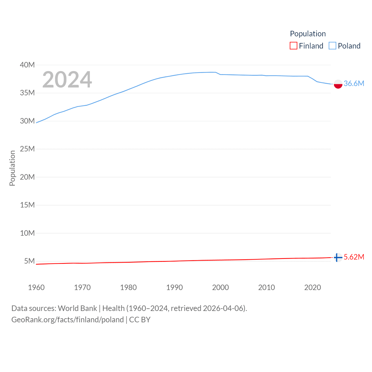 Finland has a population of 5.62M (ranked 116/197), compared with 36.6M in Poland (ranked 42/197). Finland's land area is 117,360 sq mi versus 118,252 sq mi for Poland (ranked 70th vs. 69th).