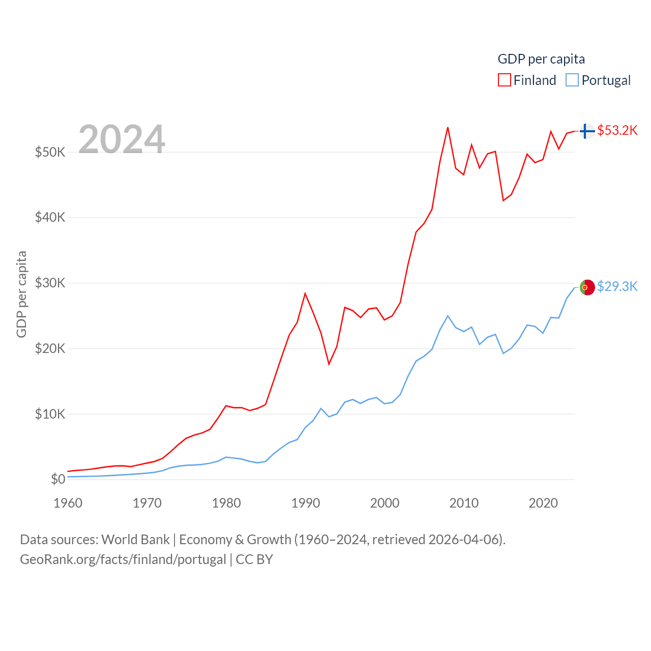 By GDP, Finland ranks 47/197 ($299B) and Portugal ranks 46/197 ($313B). By GDP per capita, Finland ranks 23/197 ($53,150), while Portugal ranks 44/197 ($29,292).
