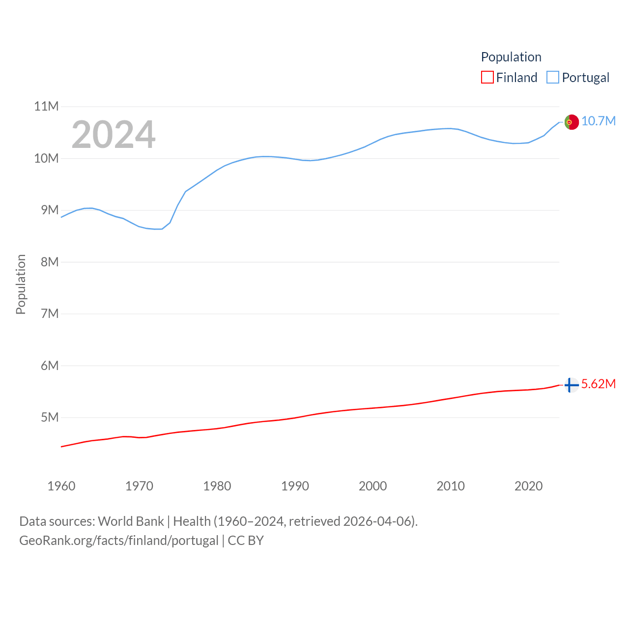 Finland has a population of 5.62M (ranked 116/197), compared with 10.7M in Portugal (ranked 90/197). Finland's land area is 117,360 sq mi versus 35,369 sq mi for Portugal (ranked 70th vs. 108th).