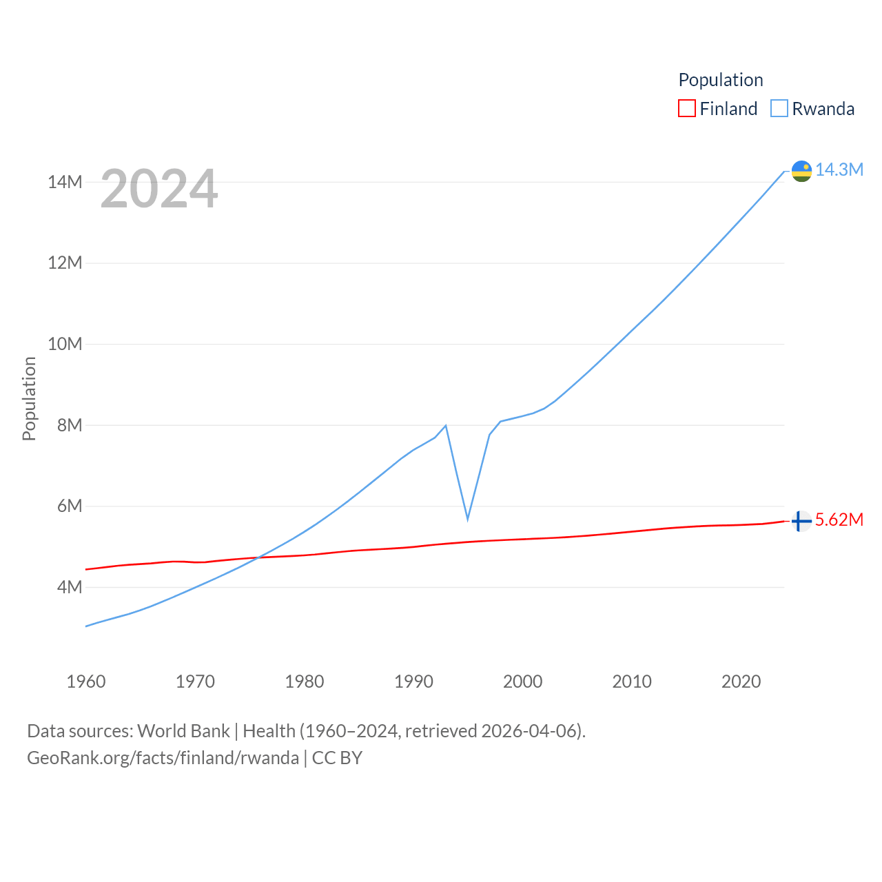 Finland has a population of 5.62M (ranked 116/197), compared with 14.3M in Rwanda (ranked 77/197). Finland's land area is 117,360 sq mi versus 9,525 sq mi for Rwanda (ranked 70th vs. 146th).