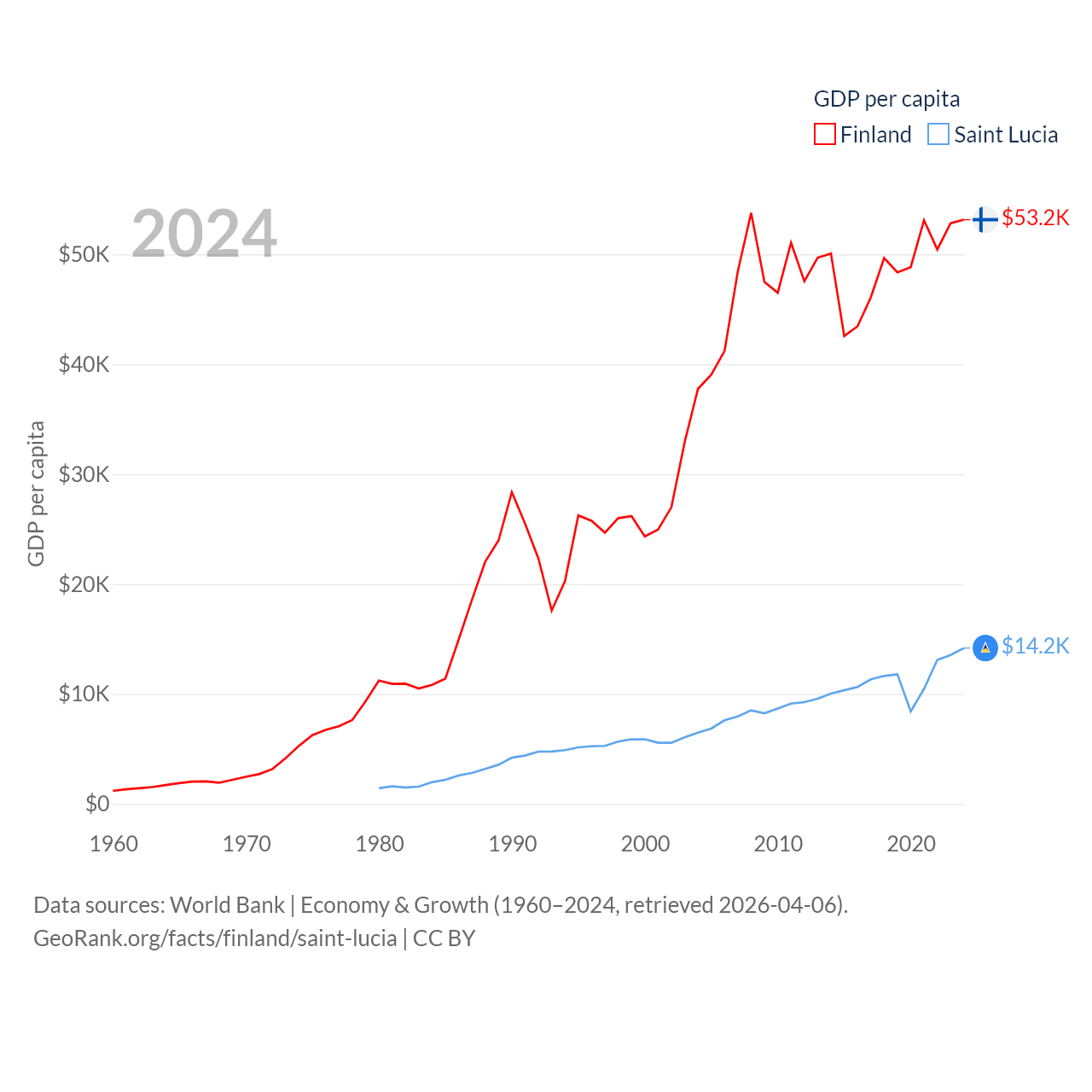 By GDP, Finland ranks 47/197 ($299B) and Saint Lucia ranks 173/197 ($2.55B). By GDP per capita, Finland ranks 23/197 ($53,150), while Saint Lucia ranks 70/197 ($14,182).