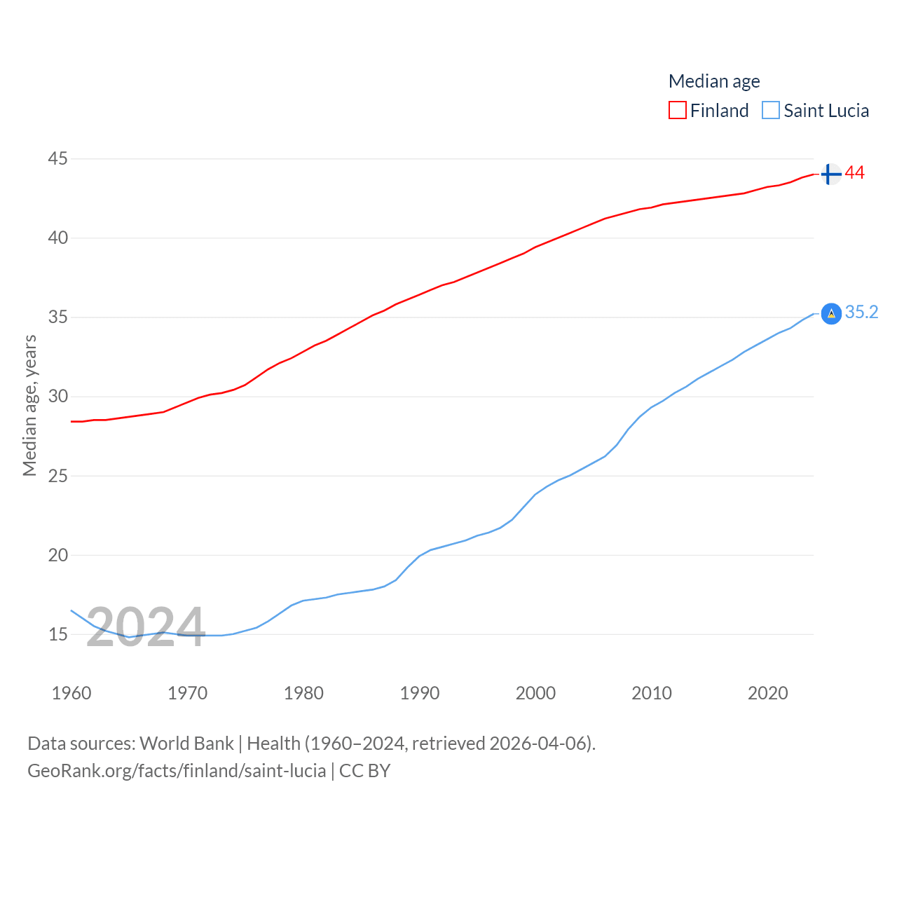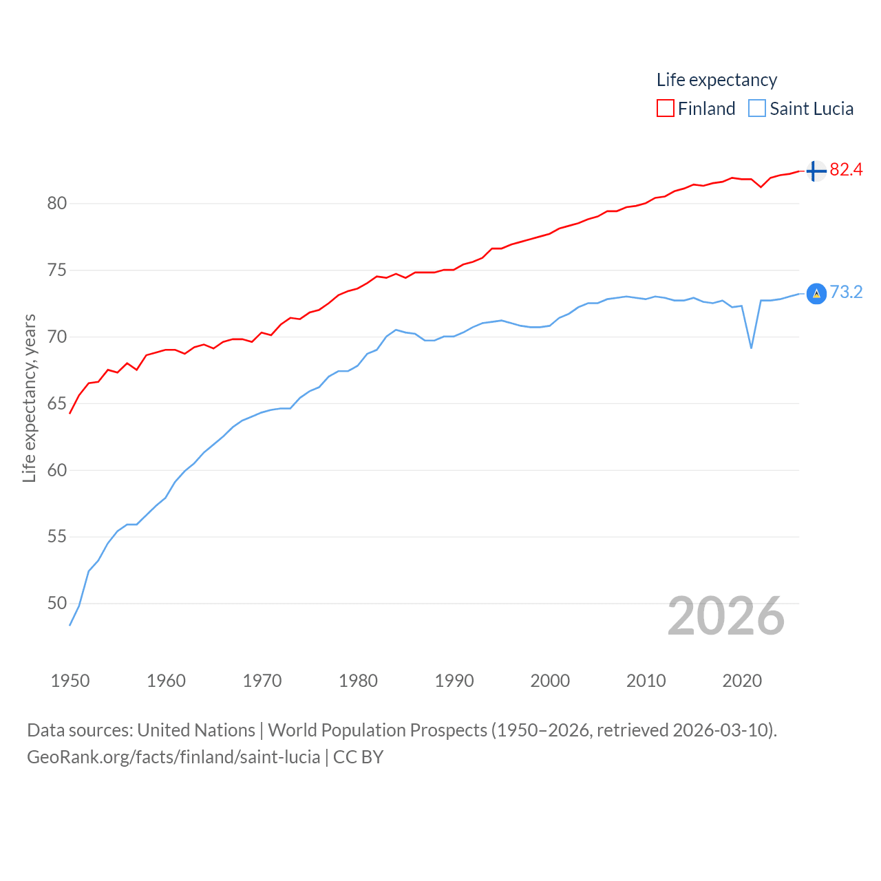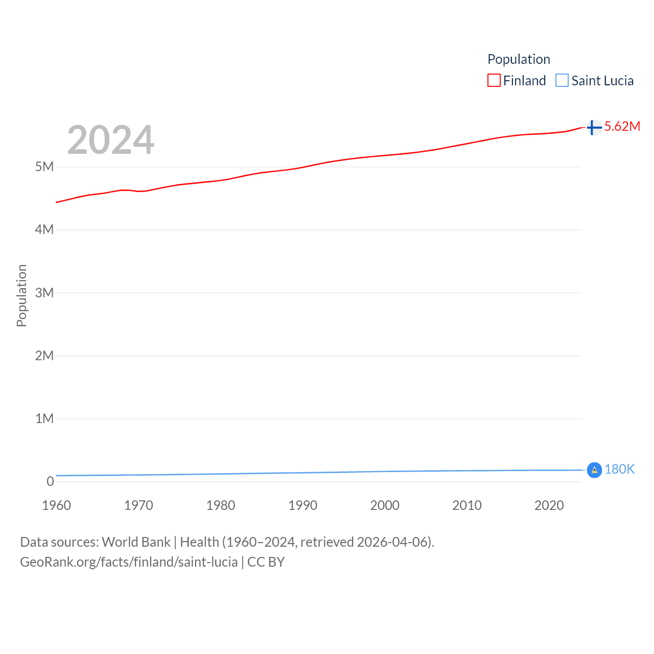 Finland has a population of 5.62M (ranked 116/197), compared with 180K in Saint Lucia (ranked 178/197). Finland's land area is 117,360 sq mi versus 235.5 sq mi for Saint Lucia (ranked 70th vs. 178th).