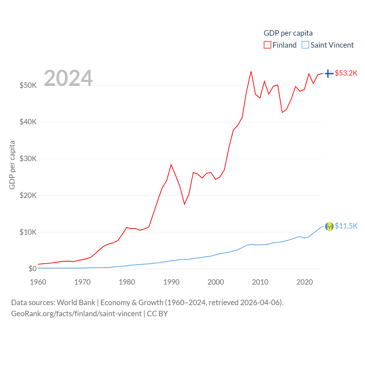 By GDP, Finland ranks 47/197 ($299B) and Saint Vincent ranks 186/197 ($1.16B). By GDP per capita, Finland ranks 23/197 ($53,150), while Saint Vincent ranks 81/197 ($11,501).