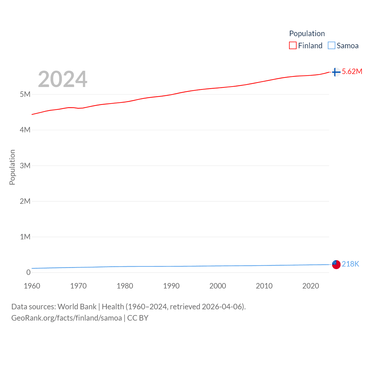 Finland has a population of 5.62M (ranked 116/197), compared with 218K in Samoa (ranked 177/197). Finland's land area is 117,360 sq mi versus 1,073 sq mi for Samoa (ranked 70th vs. 168th).