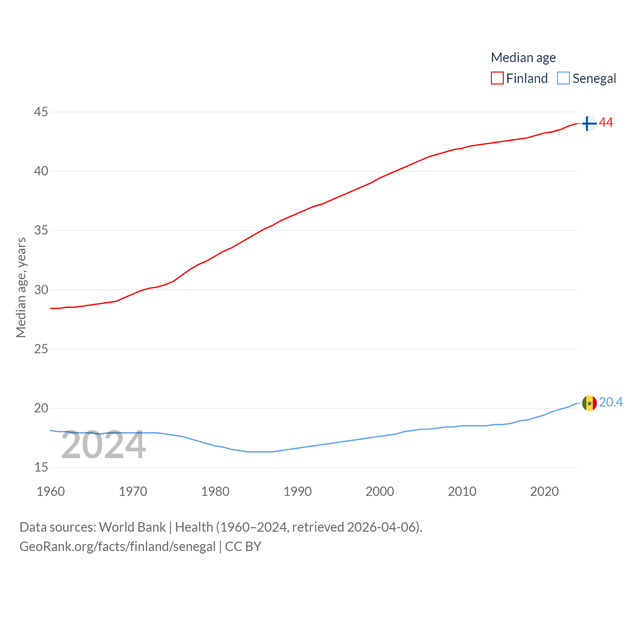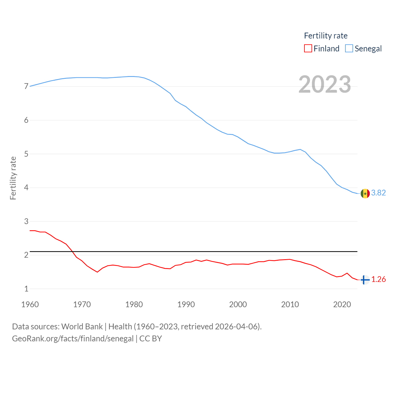 Finland has a population of 5.62M (ranked 116/197), compared with 18.5M in Senegal (ranked 69/197). Finland's land area is 117,360 sq mi versus 74,336 sq mi for Senegal (ranked 70th vs. 85th).